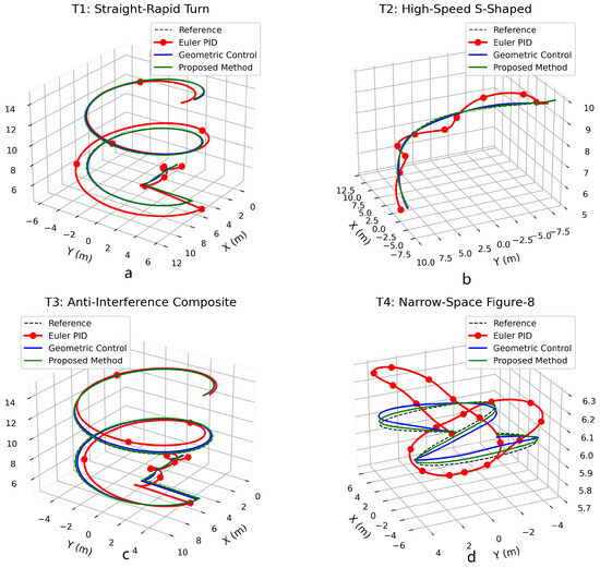 High-speed S-shaped trajectoryT2 x = 10 sin ( 0.4 t ) , y = 8 cos ( 0.3 t ) , z = 5 + 0.5 t High-frequency jerk ( j max = 15 m / s 3 ) [31]Dynamic impact adaptability