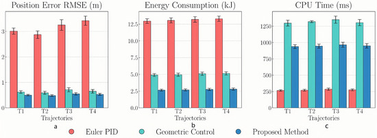 In the field of geometric control, researchers design controllers directly on the nonlinear Lie group SE(3), fundamentally avoiding the singularity problem of Euler angle descriptions and enabling global exponential stability. For example, the geometric control framework proposed by Goodarzi and Lee [13] significantly improves trajectory tracking accuracy in large-maneuver scenarios (stable at roll angles >90°) by directly controlling the attitude rotation matrix and angular velocity. However, such methods have obvious limitations: first, insufficient robustness—they are sensitive to model errors and external disturbances (e.g., unknown wind fields), and accumulated attitude errors easily lead to degraded trajectory accuracy; second, high computational complexity—frequent Lie group operations such as quaternion multiplication and rotation matrix differentiation may cause significant computational delays (increasing CPU time by 400–500% compared to PID) on embedded platforms [14]; third, low energy efficiency—the control law does not explicitly optimize energy consumption, and redundant high-frequency components in the output torque lead to frequent motor speed adjustments and increased additional energy consumption [14]. Although Wu et al. [15] simplified the nonlinear dynamic model on SO(3) using variation-based linearization, reducing computation time by 18%, the complex operations of interval matrices still increase the burden on embedded platforms, and dynamic disturbances and load variations in actual flight are not fully considered [15]. Moreover, to suppress disturbances, scholars have proposed combining nonlinear disturbance observers with geometric control (Sharma et al.) [6], or introducing adaptive extended state observers (AESOs) to estimate composite disturbances (Pu et al.; Wang et al.) [7,16], which effectively improve system anti-disturbance capability. However, these methods mostly assume a fixed UAV center of gravity (CoG), making them unable to address time-varying CoG caused by load swings (e.g., material delivery, hovering operations)—CoG deviation significantly alters the dynamic characteristics of UAVs, increasing position error by 15–20% even with effective wind disturbance suppression [17]. Existing control schemes either ignore this effect (Lotfi et al.) [17] or only implement simple adaptive compensation (Palunko et al.) [18], failing to deeply integrate with the “precision–energy consumption–real-time performance” requirements of trajectory tracking.