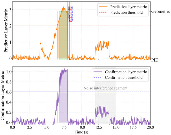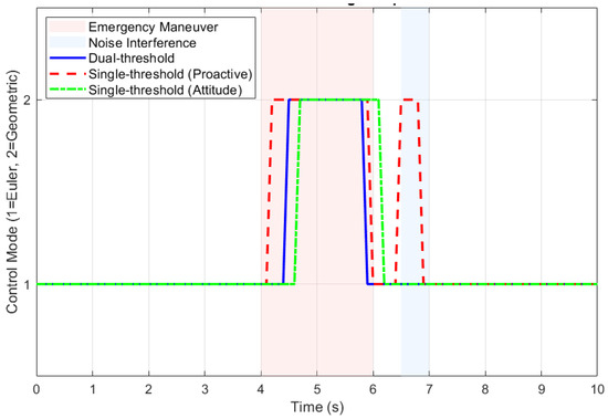 Note: The high-frequency jerk noise (amplitude 0.15–0.13) added during 6.5–7.0 s in this table refers to the trajectory measurement noise bandwidth of quadrotor GPS/IMU [17,18], simulating random interference of sensors in real flight. It matches the disturbance suppression range of the extended state observer in [7], which can verify the anti-noise capability of the switching mechanism.