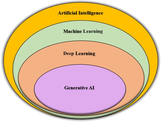 In the above-mentioned scenarios, since the cost of directly producing multimodal images from medical devices is high [19], a practical solution is the generation of 3D images from 2D images, as this will improve the analysis as well as diagnosis in healthcare settings. Ref. [20] suggests that reconstructing 3D images from X-rays is an ideal method for visualizing a patient’s anatomy for clinical analysis. This approach is cost-effective, widely accessible, and minimizes the patient’s exposure to radiation compared to other imaging techniques. The solution lies in the use of Generative AI models; these are a form of machine learning models that create new data based on patterns and structures they learn from existing data/training data. These generative models have enriched the existing medical datasets in recent years by producing realistic synthetic data [21]. Generative AI has had a significant impact across various fields, including image generation, text creation, music composition, drug discovery, and healthcare [22], and is also very effective in the early diagnosis of underlying conditions [23]. Most popular among these are GANs and Transformers. To visualize the hierarchy and relationship between AI, Machine Learning (ML), Deep Learning (DL), and Generative AI, a Venn Diagram is presented in Figure 1. AI represents the broad field of creating intelligent systems, while ML is a subset of AI that enables machines to learn from data. Within ML, DL is a more specific approach involving neural networks with multiple layers. Generative AI falls under DL and ML, focusing on models that can generate new data resembling the training data. In recent years, Generative AI has received significant attention due to the huge amounts of data and the increasing sophistication of the computing technologies [24,25]. The Figure 1 provides a comprehensive overview with a conceptual hierarchy for the readers, providing a clearer understanding of where Generative AI stands in the overall landscape. It establishes a logical progression towards this paper’s main focus: the use of Generative AI in 3D medical imaging.