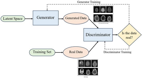 - Sravani, M.; Aparna, S.; Sabarinath, J.; Kakarla, Y.; Shyam Ganesh, K.; Maddineni, S.; Aparna, S. Enhancing Brain Tumor Diagnosis with Generative Adversarial Networks. In Proceedings of the 2024 14th International Conference on Cloud Computing, Data Science & Engineering (Confluence), Noida, India, 18–19 January 2024; IEEE: New York, NY, USA, 2024; pp. 846–851. [Google Scholar]