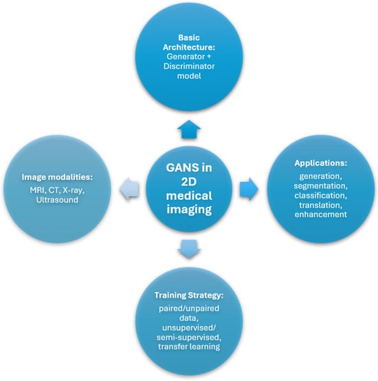 - The extensive use, applications, and proven effectiveness of GANs in 3D medical imaging for data generation, super-resolution, denoising, cross-modality translation, segmentation, and reconstruction [26,27,28];