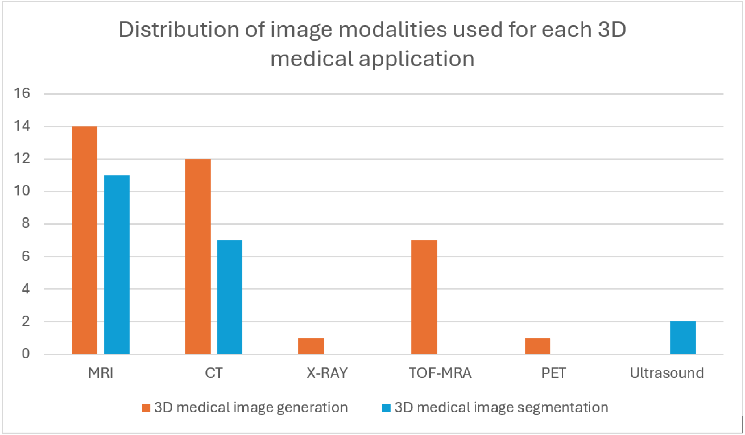 - Ultrasound: In total, 3% of the reviewed papers worked with ultrasound images.