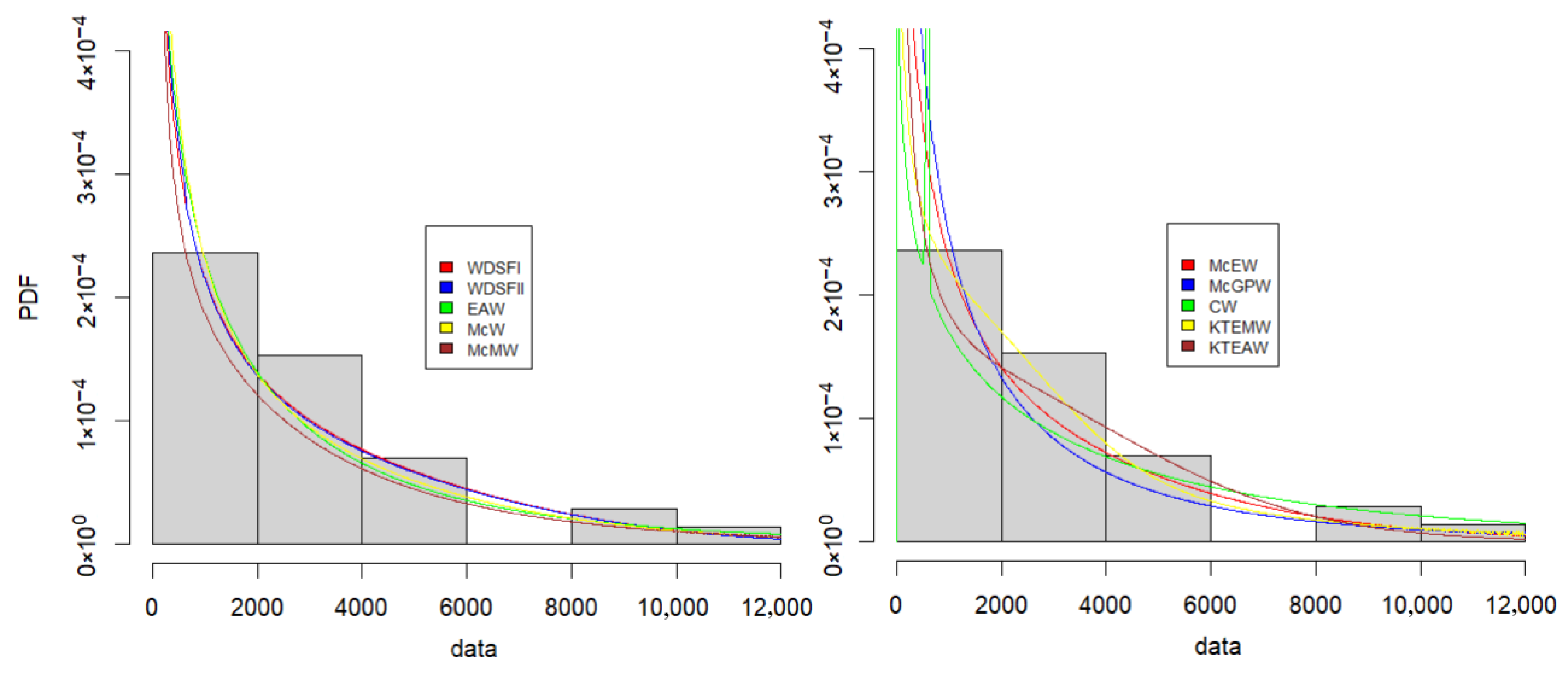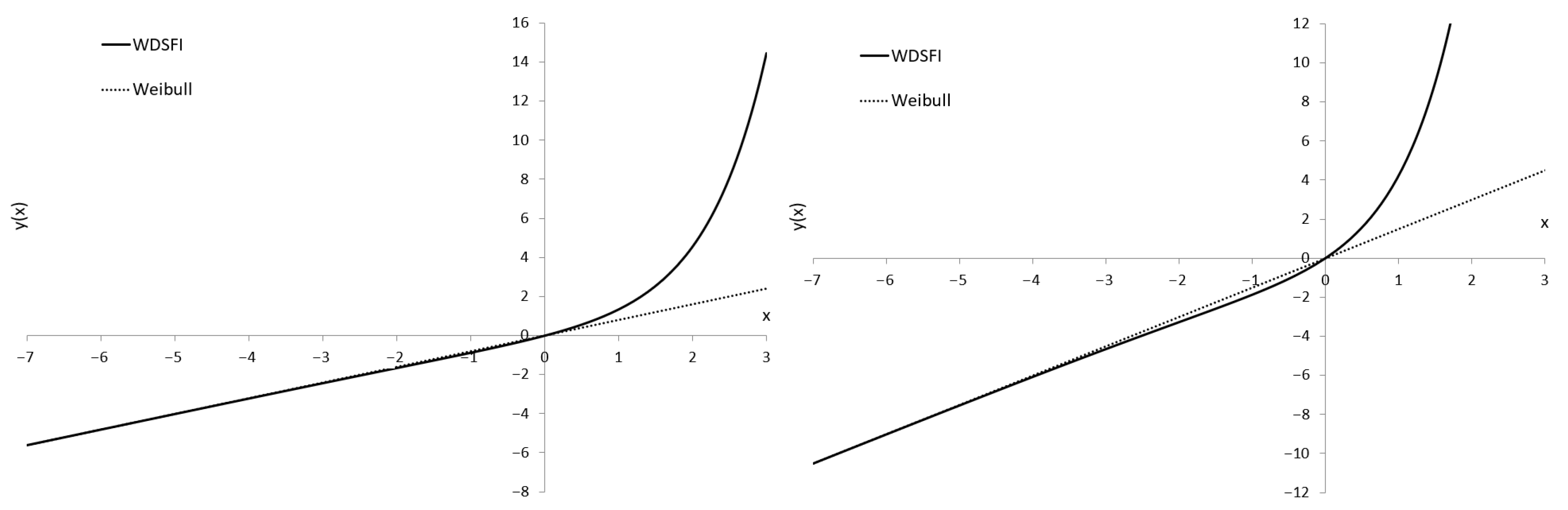 What relates to the WDSFII is that the main fraction of the probability mass is concentrated on the “contractual” end of the distribution. Thus, for small and medium values of t, the Weibull and WDSFII are practically indistinguishable in terms of the reliability or density functions. Censoring appears to be inapplicable to the Weibull-sf except in some special cases. This is the reason why in the reviewed paper a problem of censoring has been omitted. Please notice that this is the same inconvenient situation as with the compound Weibull lifetime model. Finally, one should not marvel at this because the WDSFII has been designed as a “lighter” version of the compound Weibull lifetime model.