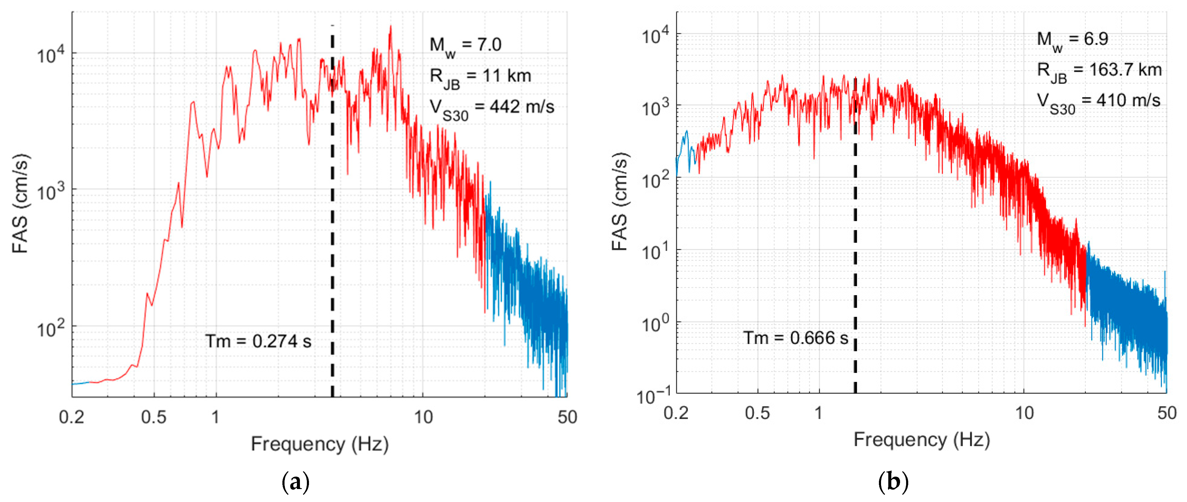 Figure 2 demonstrates the FAS of two records of the current dataset, from earthquakes with similar magnitudes and sites with similar V