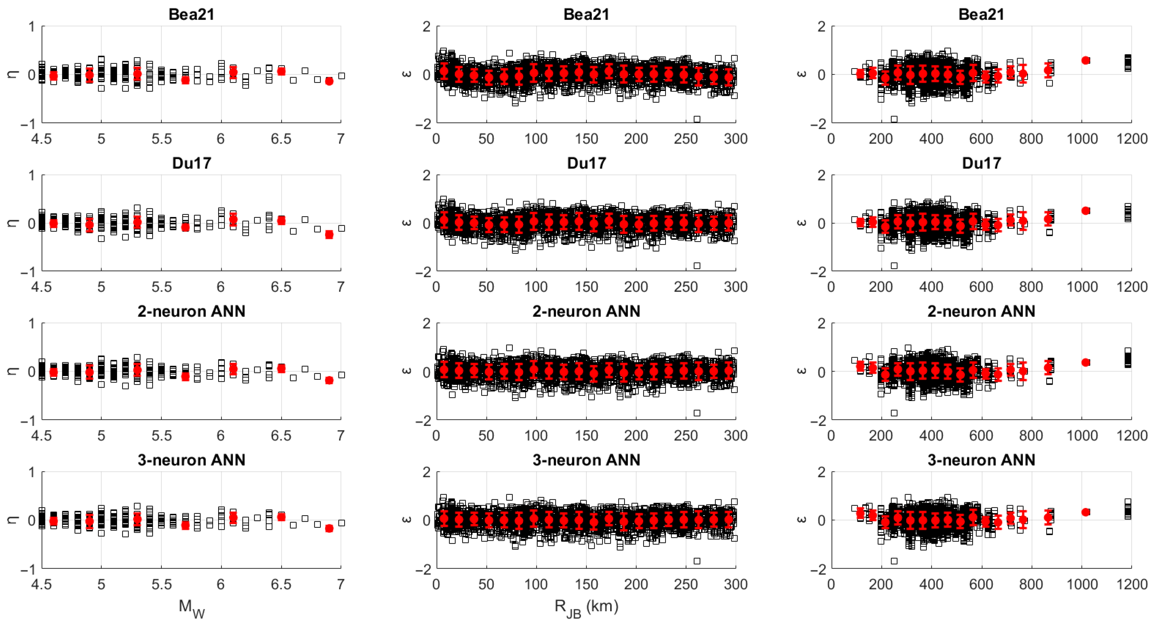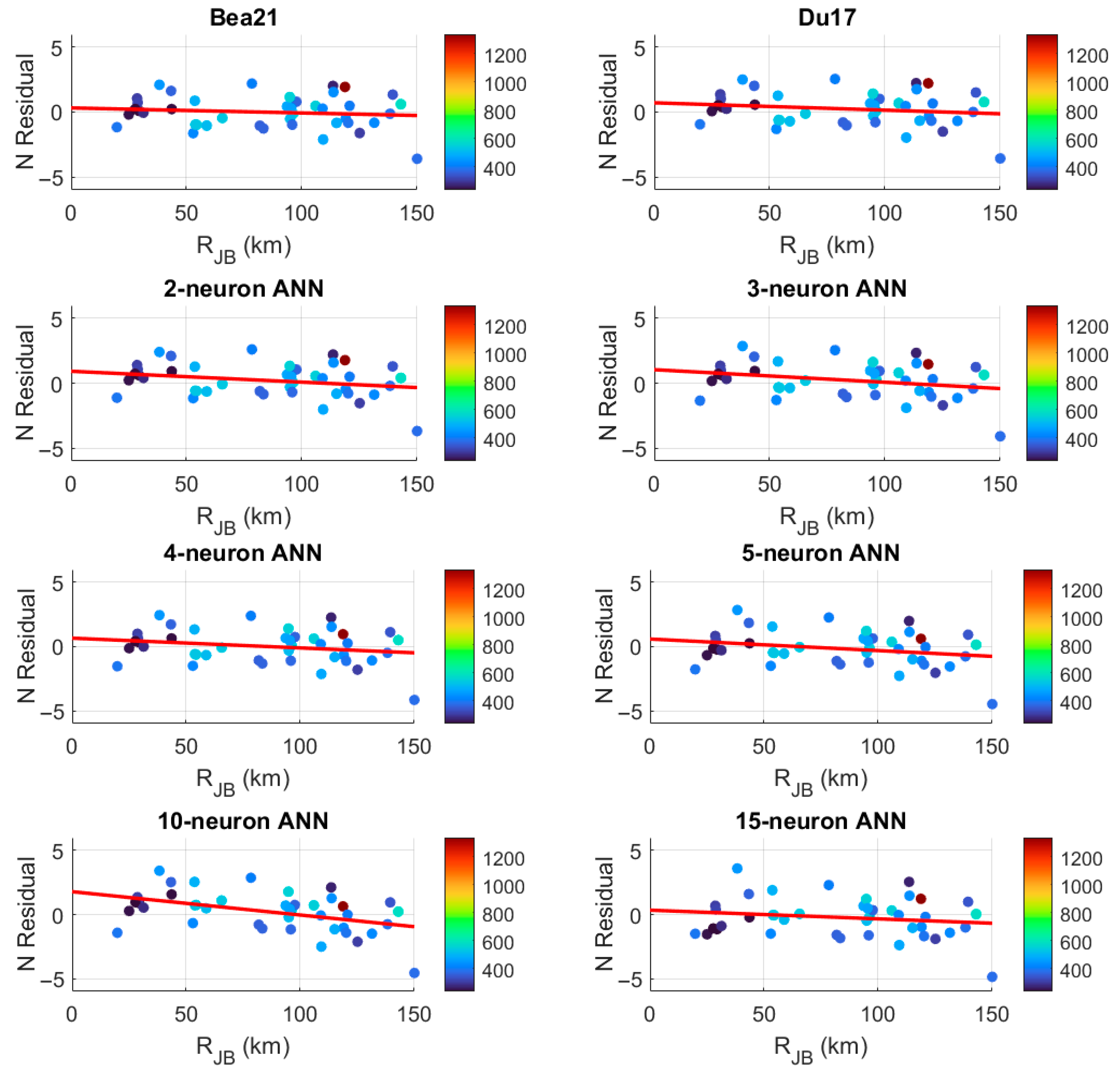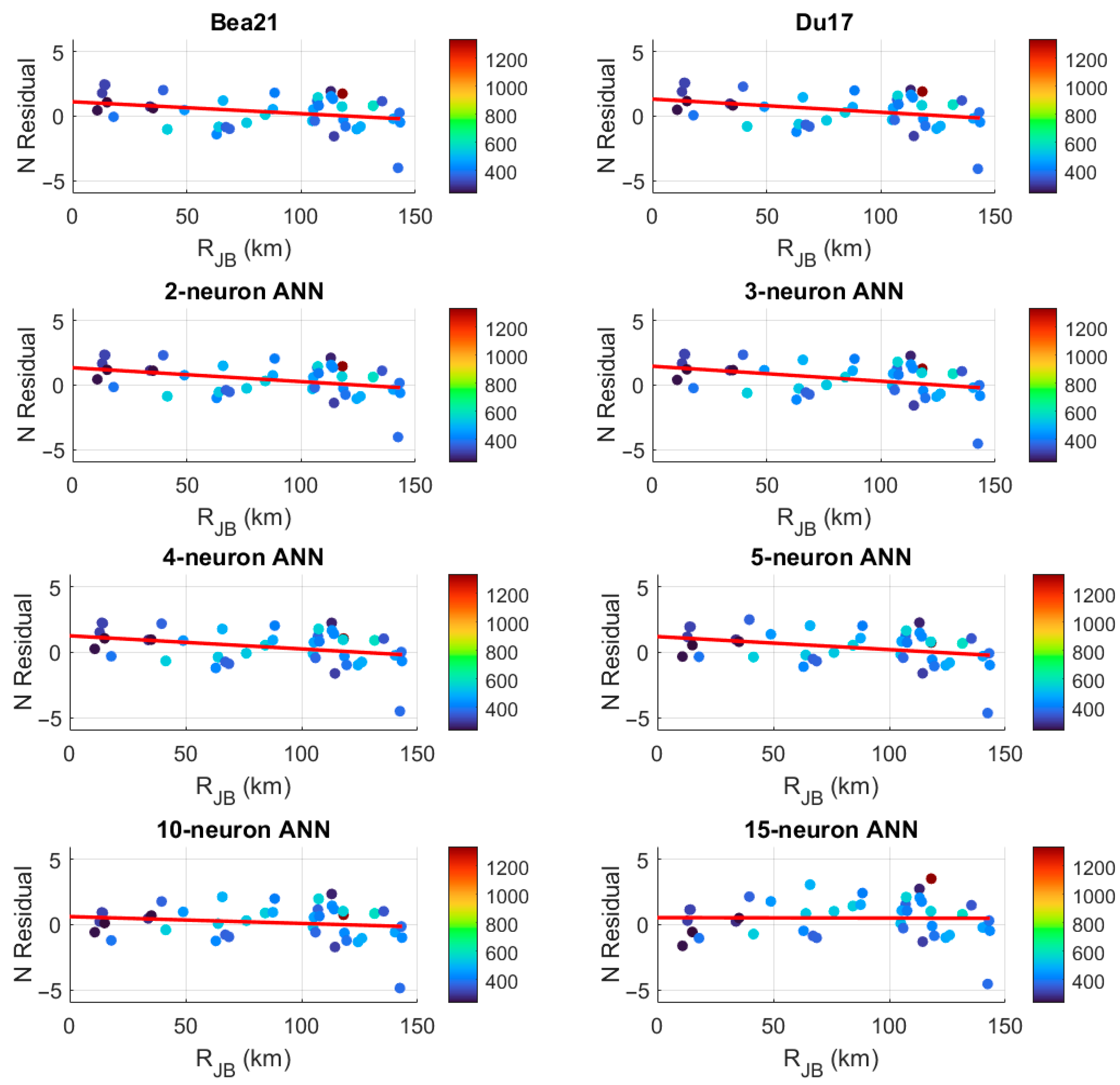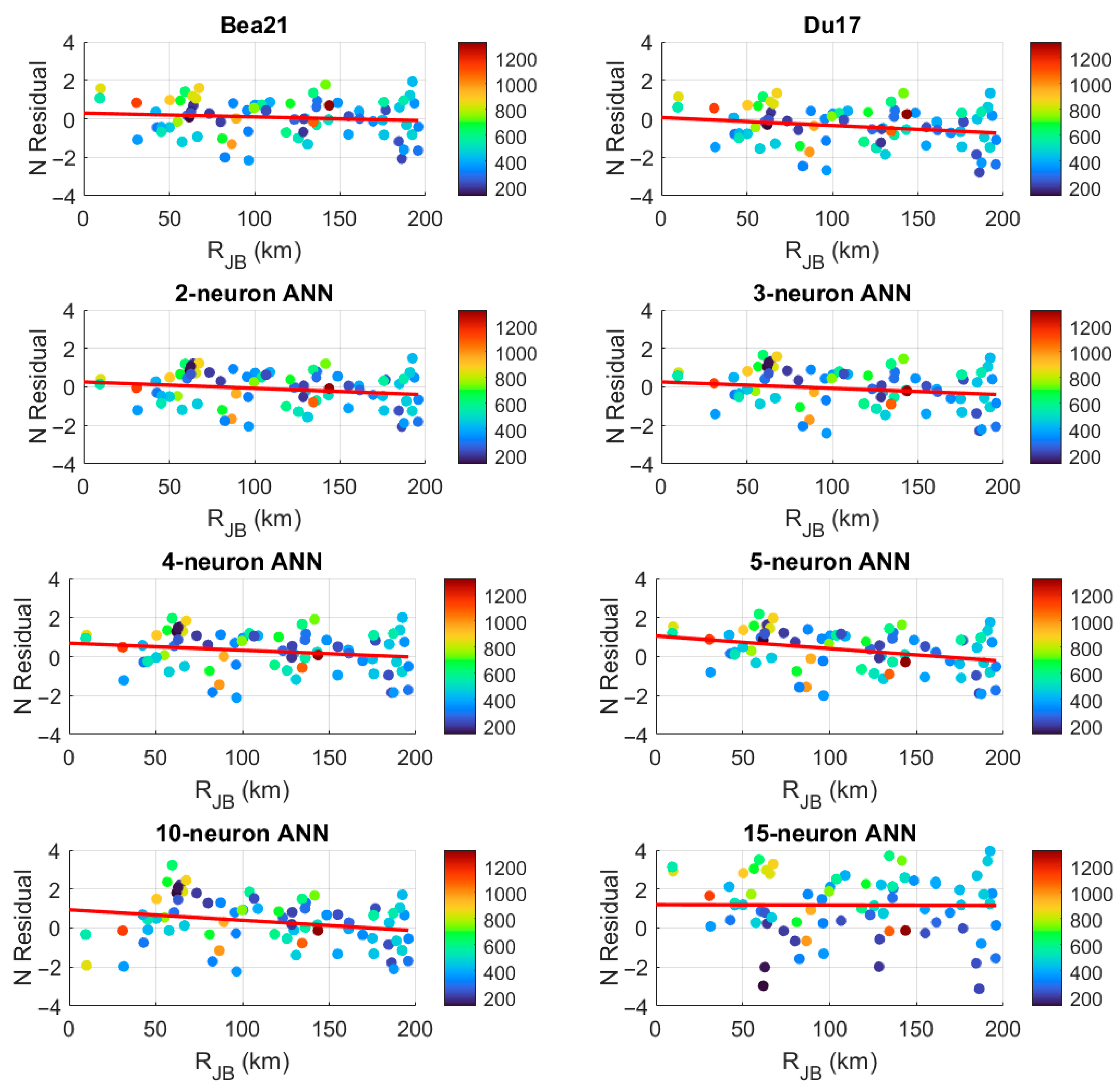 JB. The normalized residuals are defined as the residuals computed through Equation (7), normalized to the standard deviation of each GMPE. Bea21, Du17, and the 2- and 3-neuron ANNs present a minor bias of normalized residuals with distance, whereas the absolute value of the mean trend is close to zero. On the other hand, the 4-, 5-, and 10-neuron ANNs exhibit increased residuals for source-to-site distances smaller than 100 km. The normalized residuals of the 15-neuron ANN do not depict a significant trend with R