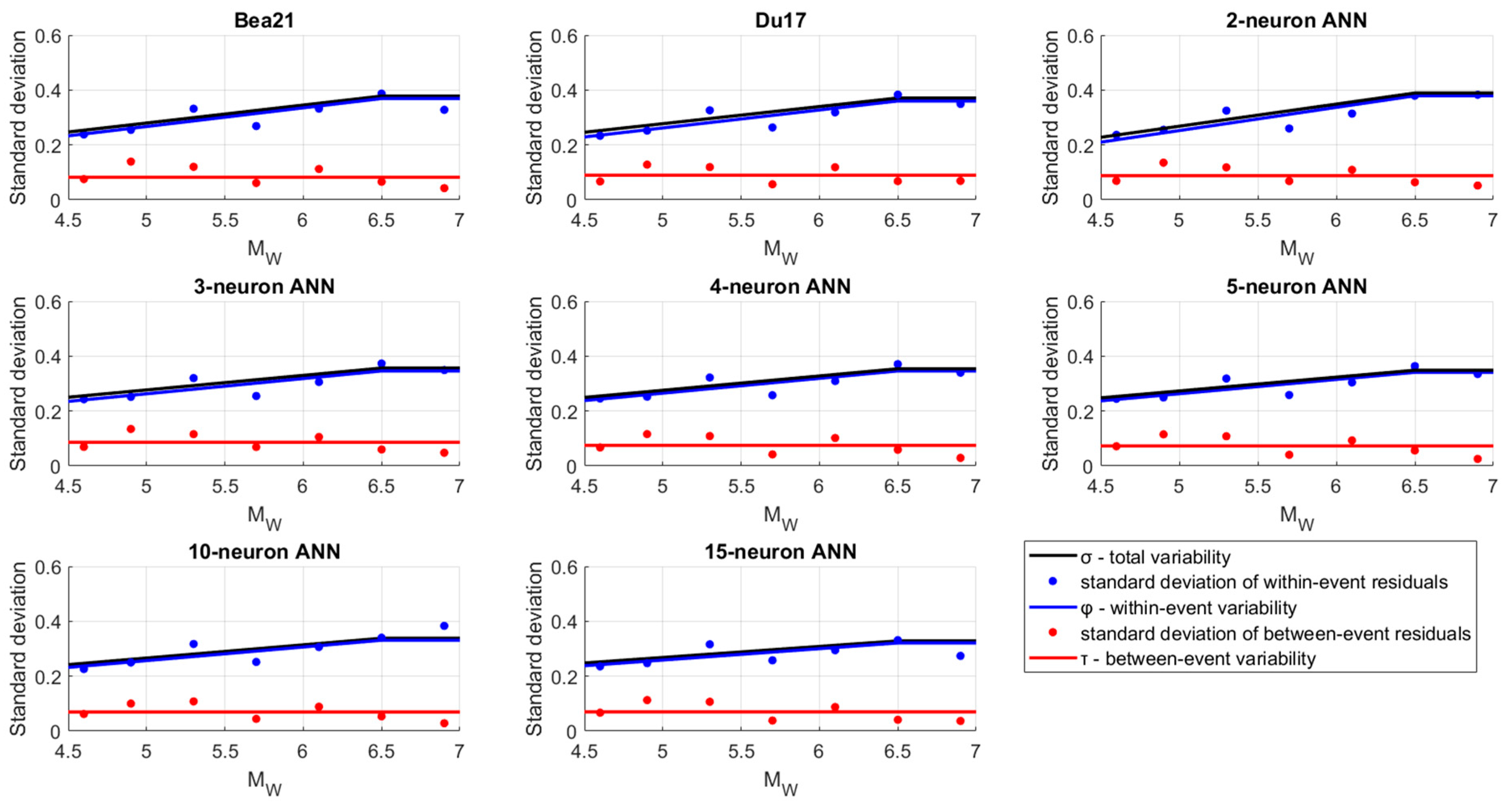 m is useful as it brings enhanced predictive capabilities, reduces prediction uncertainty, and captures nonlinearities between the predictor and the response variables, provided that the training dataset is complete. Otherwise, care should be taken when implementing complex ANN-based models, especially when considering cases which lie on the edge of models’ applicability. The more traditional regression-based GMPEs are still important, as their functional form represents relationships inspired by fundamental theory physics-based processes, as well as earthquake data observations. A combination of these model development techniques may be optimal, especially in cases or data regions where the amount of data is limited. Future research may attempt to include directivity effects, as well as a residual analysis of station-to-station variability. The reasons for not addressing these issues herein is the lack of directivity effects proxies in the dataset and that the majority of the stations of the dataset had fewer than five recordings, so the robustness of station-to-station variability may be questionable, as also discussed in [