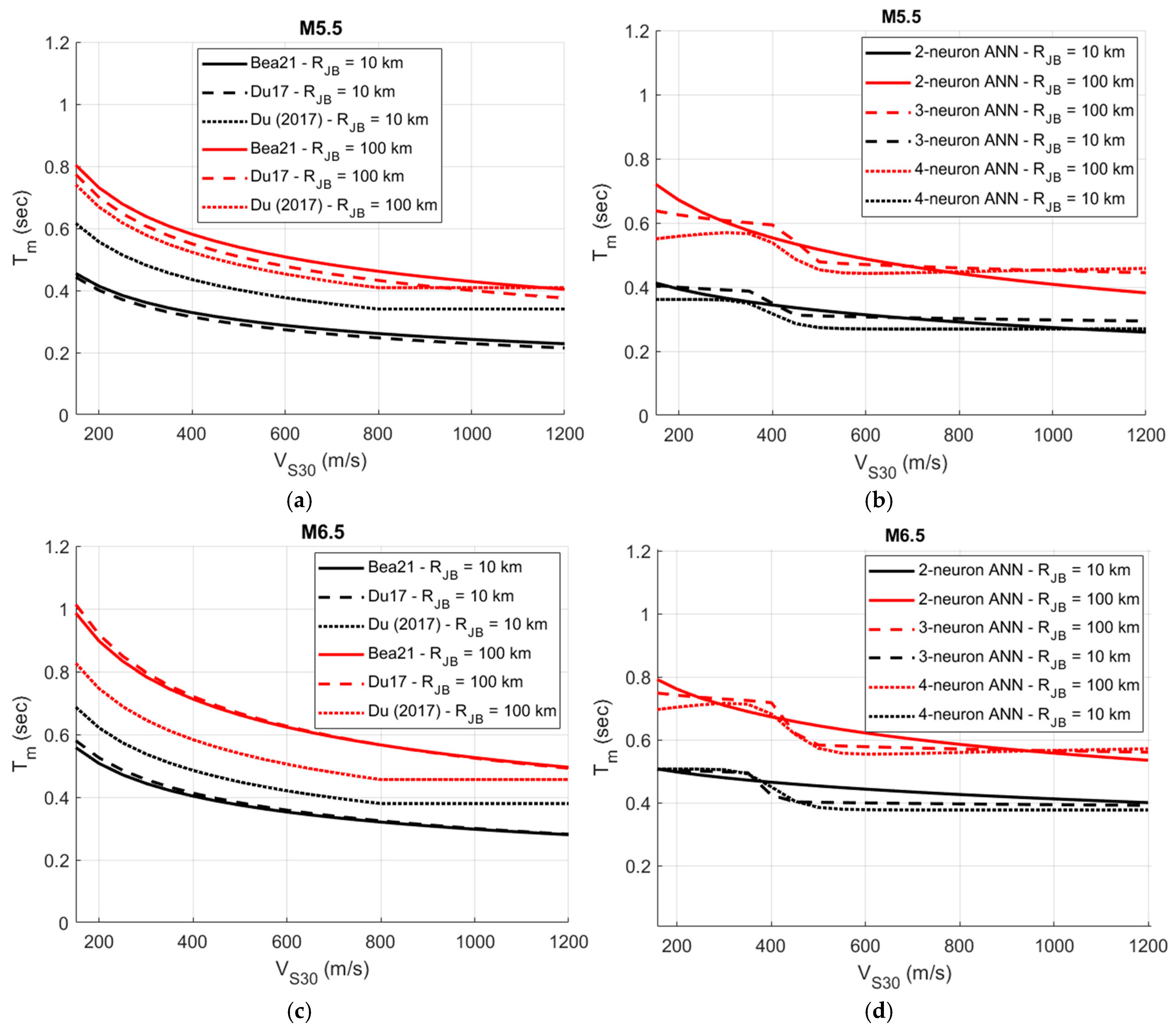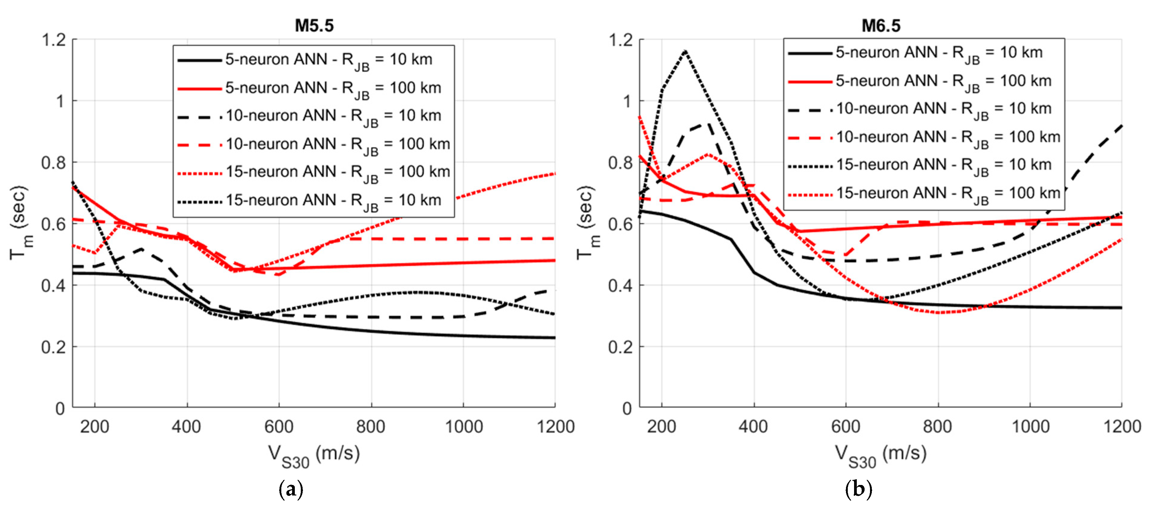 S30 scaling and is similar to the 3- and 4-neuron ANNs, both in values and trends, for both earthquake magnitudes. On the other hand, the 10- and 15-neuron models exhibit theoretically non-consistent trends, which is possibly due to overfitting of the ANNs to the dataset.