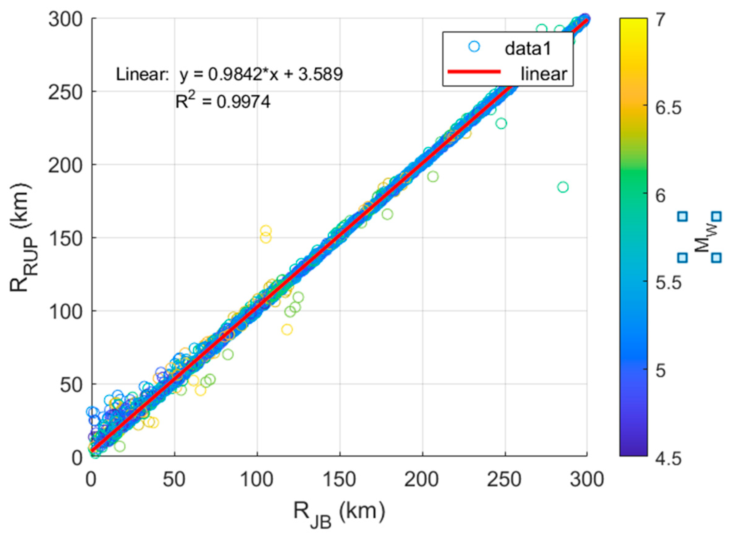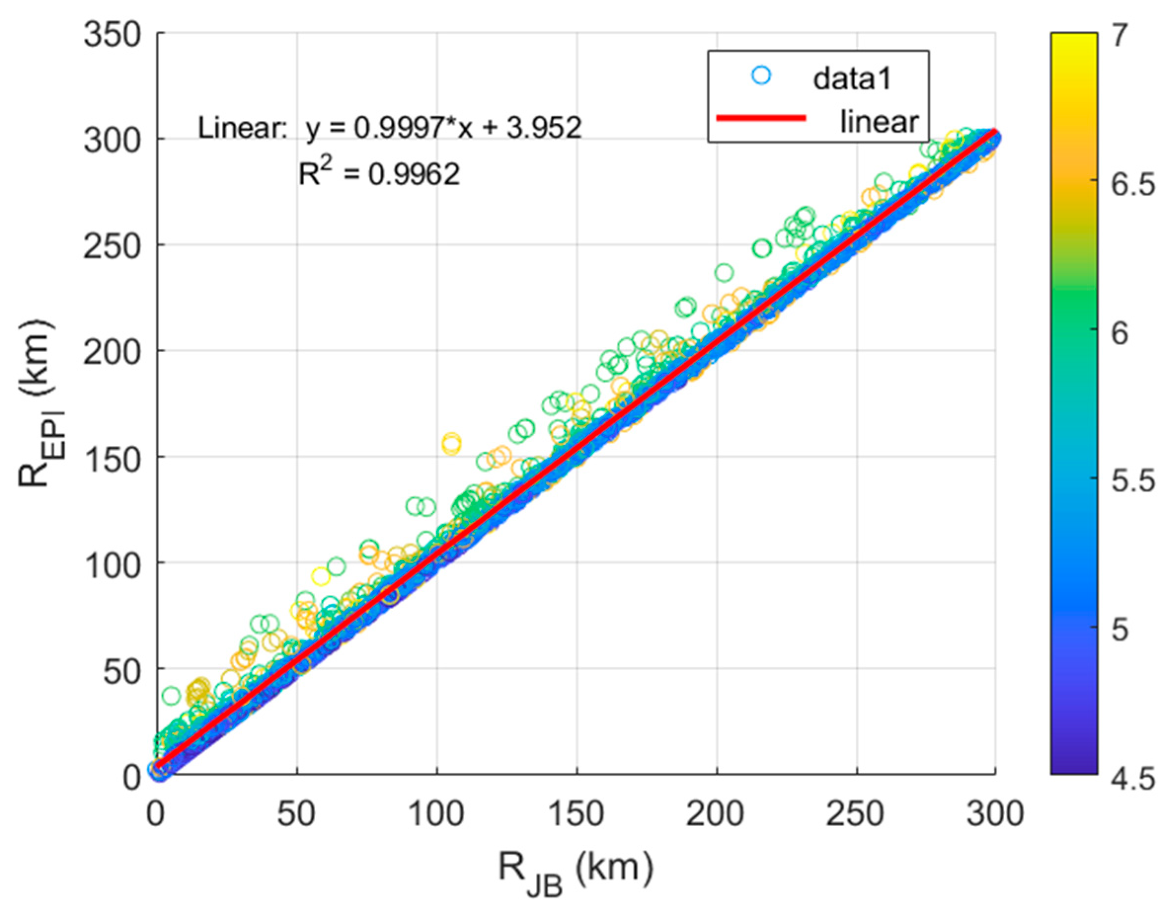 JB, ranges from 1 km to 300 km, with near-source data being limited. More specifically, 62% of the data correspond to an R