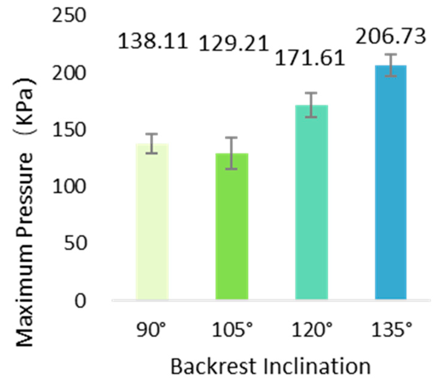 Figure 8 show the effect of backrest inclination on the pressure distribution. Average and maximum pressures on the backrest generally increased with greater inclination, though this trend was nonlinear, characterized by an initial decrease followed by an increase. Two mechanisms explain this: one is increased load sharing, i.e., greater backrest inclination shifted more upper body weight onto the backrest, increasing the proportion of total body load supported dorsally and significantly elevating maximum pressure. The other is area–force imbalance, i.e., the increase in total force exerted on the backrest exceeded the concurrent expansion of the contact area, driving up the average pressure.