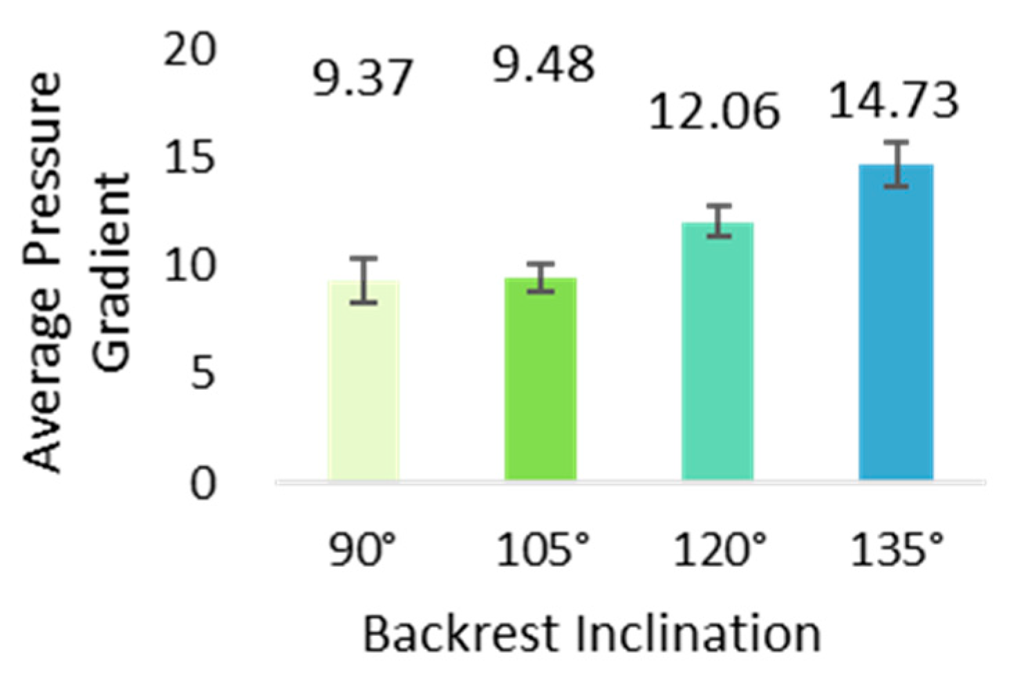 Figure 12 depict the effect of backrest inclination on pressure gradient. Both average and maximum pressure gradients showed significant positive correlations with increasing backrest inclination, reaching their maximum values simultaneously at 135°. At inclination angles of 90° and 105°, pressure gradient values remained comparatively low, reflecting a balanced pressure distribution between the occupant and backrest, along with optimized support efficiency. The consistently lower gradient values observed at inclinations ≤ 105° further corroborate the existence of the ‘critical state of pressure equilibrium’ proposed in the previous section.