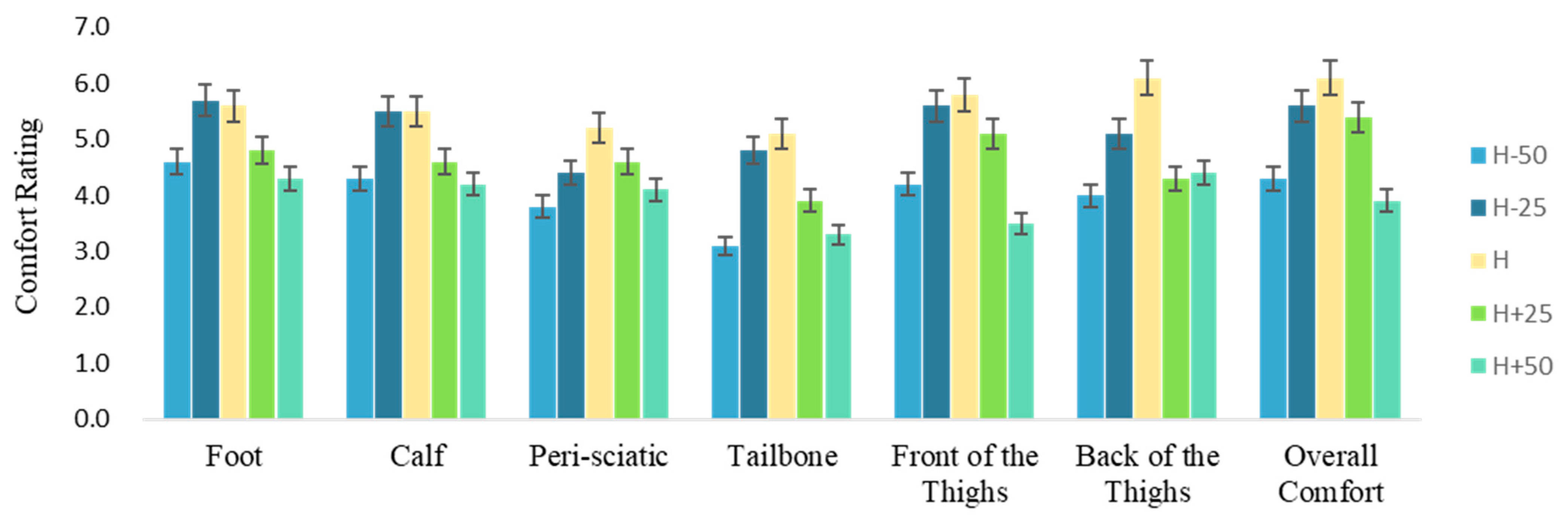 Figure 13 illustrates the effect of seat height on subjective comfort. Comfort scores followed a unimodal distribution relative to seat height, peaking at the baseline height (H mm) with a mean overall score of 6.1 at H + 50 mm, scores decreased to their lowest value with mean value of 3.9. Within the range of H − 25 mm to H mm, regional comfort perception and overall scores were significantly superior to other height configurations. Consequently, for elderly users, the recommended seat height is optimized between 25 mm below and equal to popliteal height (H − 25 mm to H mm) to maximize ergonomic adaptation.