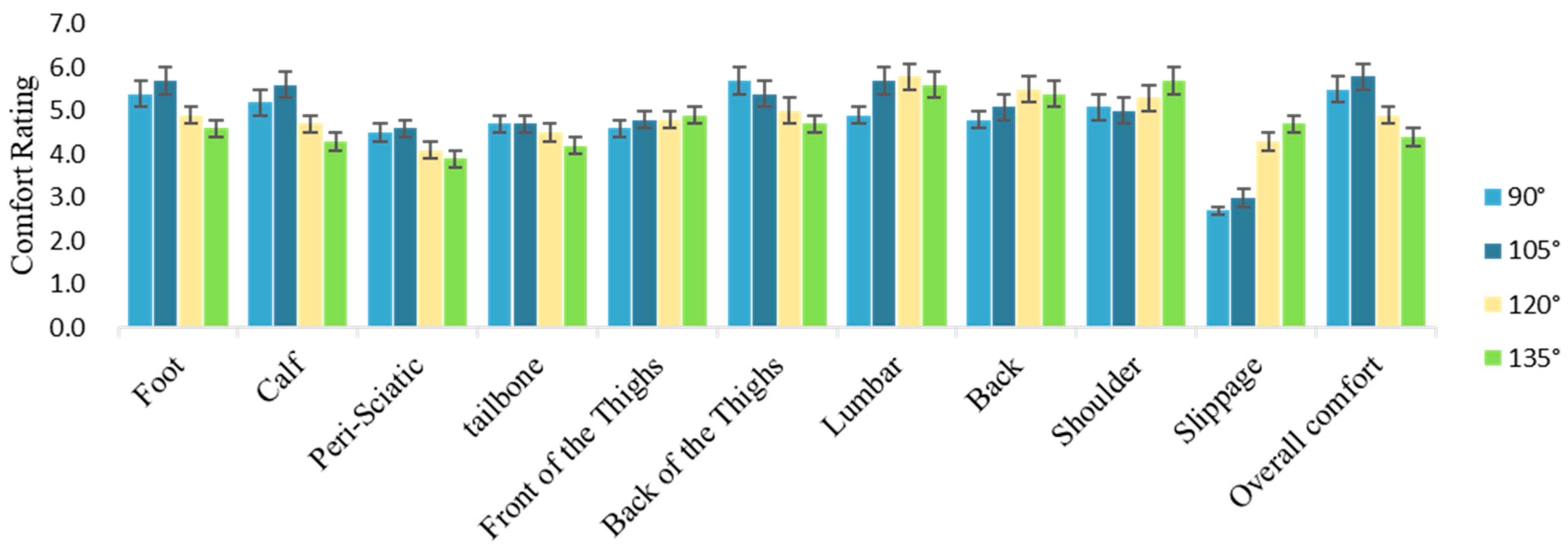 Figure 14 depicts the effect of backrest inclination on subjective comfort. Overall comfort increased gradually between 90° and 105°, peaking at 105° (mean value of 5.8), where regional comfort metrics were concurrently optimal. Beyond 105°, comfort declined markedly (mean value of 4.4 at 135°). This reduction is attributable to (1) diminished foot–ground contact area reducing postural stability due to insufficient friction and (2) backward gravitational shift inducing muscular compensation that accelerates fatigue accumulation. These findings establish 105° as the critical threshold for the synergistic optimization of pressure distribution balance and postural stability.