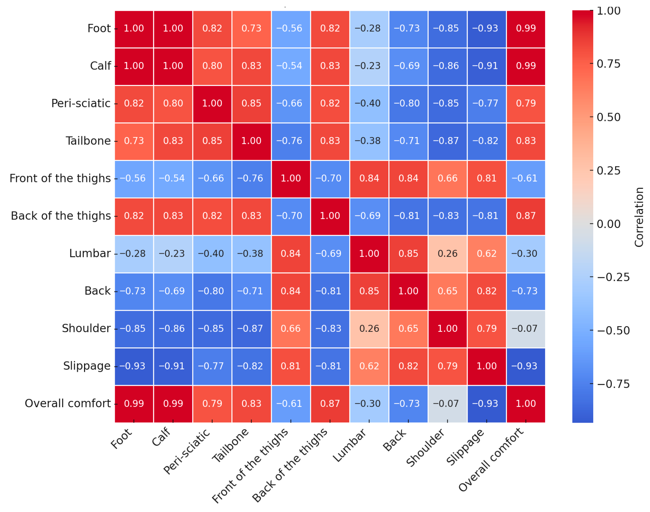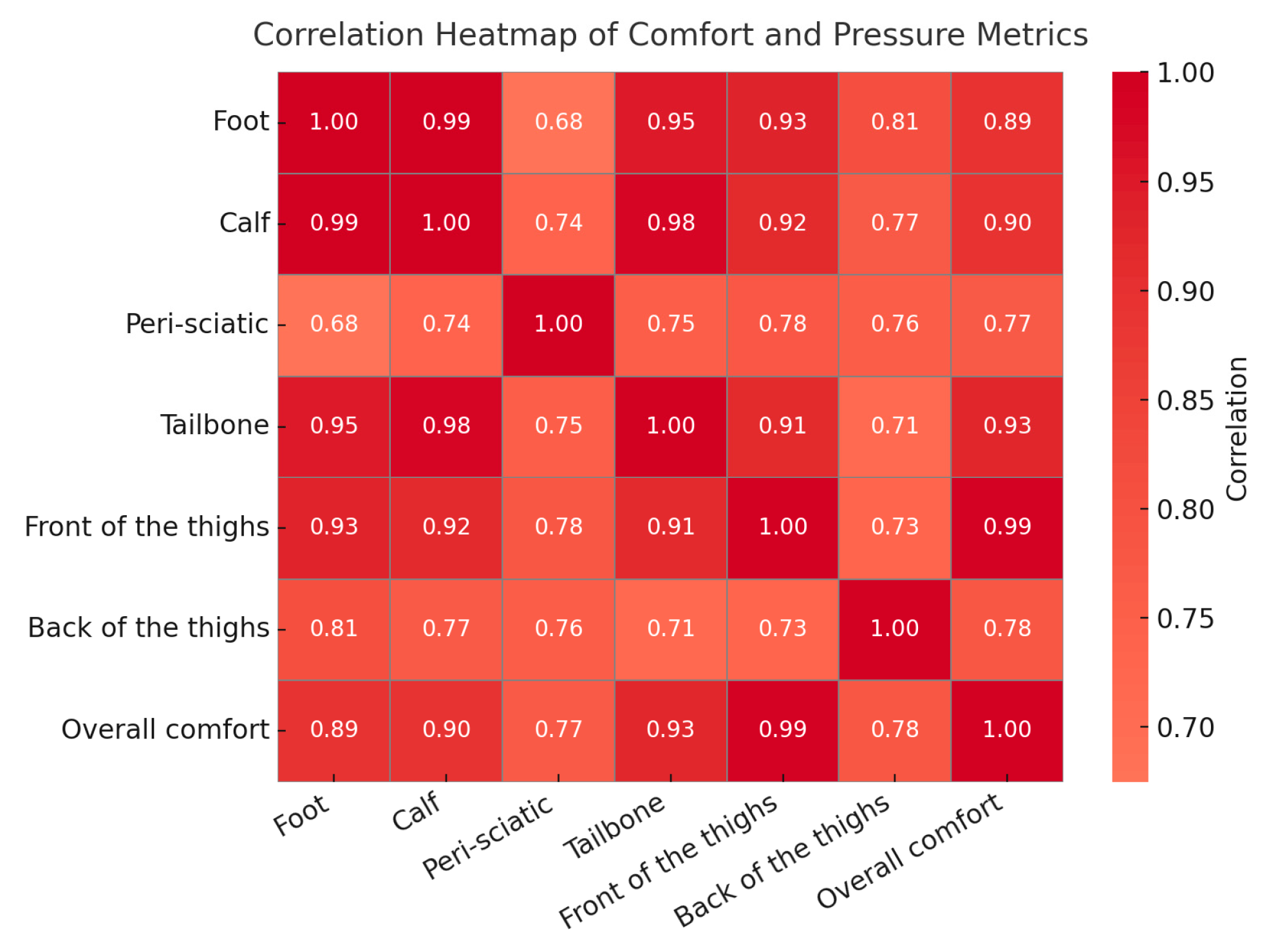 p < 0.01), identifying these regions as primary drivers of overall comfort. Calf comfort correlated significantly with foot, coccyx, and anterior thigh comfort (