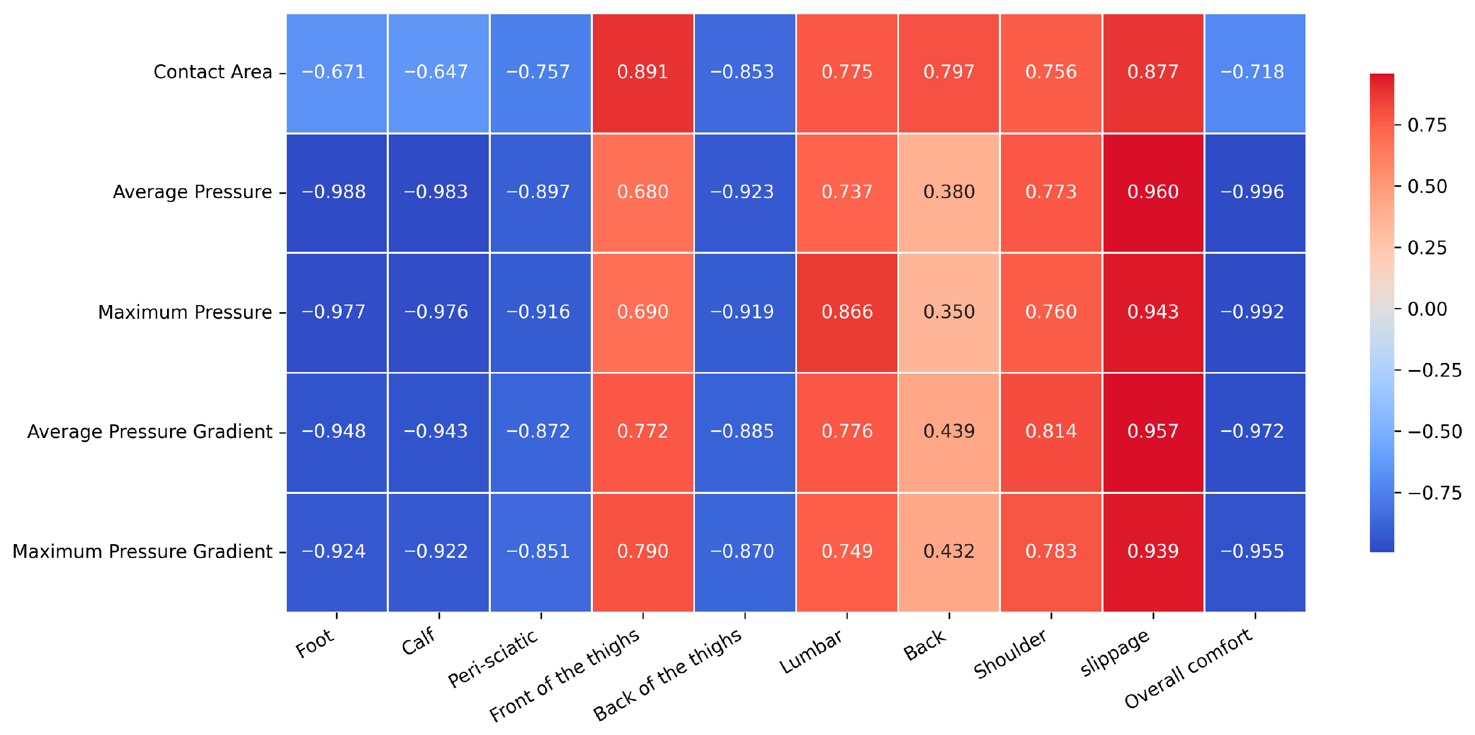 Figure 20 synthesizes system-level associations. Overall comfort correlated negatively with mean/maximum pressure (kPa) and pressure gradients (kPa/cm) (