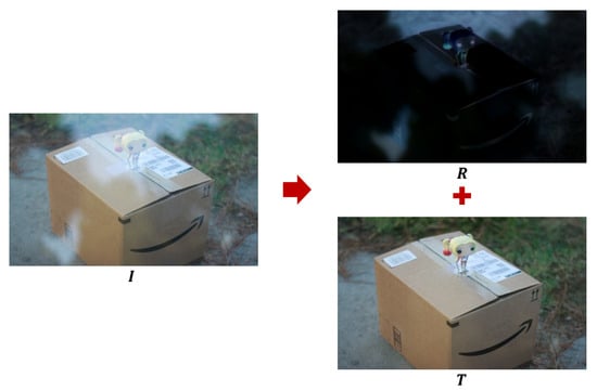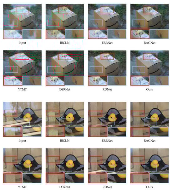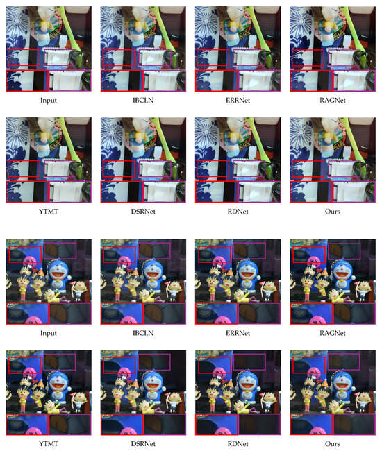 In the rapidly evolving fields of computational photography and computer vision, removing reflections from single images has emerged as a critical research problem. This task holds significant practical value for enhancing image quality in diverse applications, including object recognition, scene reconstruction, and augmented reality [1,2,3]. As illustrated in Figure 1, reflections primarily occur when images are captured through transparent media such as glass, typically resulting in a composite image that merges the desired transmission of the scene behind the glass with an undesired, mirror-like reflection.