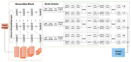 To address the limitations of fixed gating patterns in earlier dual-stream networks, our encoder incorporates reversible architectures (described in detail below) to maintain information integrity during feature extraction [11,24]. The encoder generates deep feature representations that are shared across both streams, allowing the transmission and reflection decoders to exploit the same low-level features. Each decoder branch then specializes in reconstructing one layer ( or ) from these features. By passing encoder features via skip connections to each decoder, the model ensures that both transmission and reflection streams incorporate detailed semantic information at multiple scales.