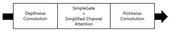 The basic structure of a NAFBlock, shown in Figure 3, consists of a depthwise convolution, a SimpleGate operator, a Simplified Channel Attention (SCA) module, and a pointwise convolution. Each component plays a distinct role in efficient feature transformation. The depthwise convolution processes each channel independently to extract spatial features while significantly reducing computational cost compared to a standard convolution. The SimpleGate mechanism splits the feature channels into two parts and applies element-wise gating , where is the sigmoid activation function, and ⊙ denotes element-wise multiplication. This operation enables selective information flow without relying on computationally expensive attention mechanisms. The SCA module computes a lightweight channel-wise importance vector to rescale features, thereby enhancing informative channels and suppressing less relevant ones. Finally, the pointwise convolution performs a convolution to mix information across channels, integrating the spatially processed features from the depthwise stage.