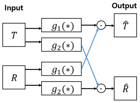 The Mutually-Gated Interaction (MuGI) block, as depicted in Figure 5, enables explicit feature exchange between the transmission and reflection streams. Here, denotes the feature map of the transmission stream, and denotes the feature map of the reflection stream, where C, H, and W are the number of channels, height, and width, respectively. Each stream’s features ( and ) are processed through two gating functions, and . Unlike additive fusion, these functions generate gating maps that are multiplied across streams, ensuring that is modulated by information from , and by information from . The cross-connections in the figure illustrate how the network mutually enhances or suppresses features between the two streams, enabling complementary learning for more robust and interpretable layer separation.