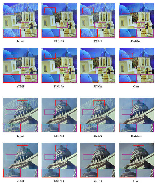 Qualitative comparison on the Postcard dataset. The red and purple squares are enlarged sections where reflection removal has been applied.