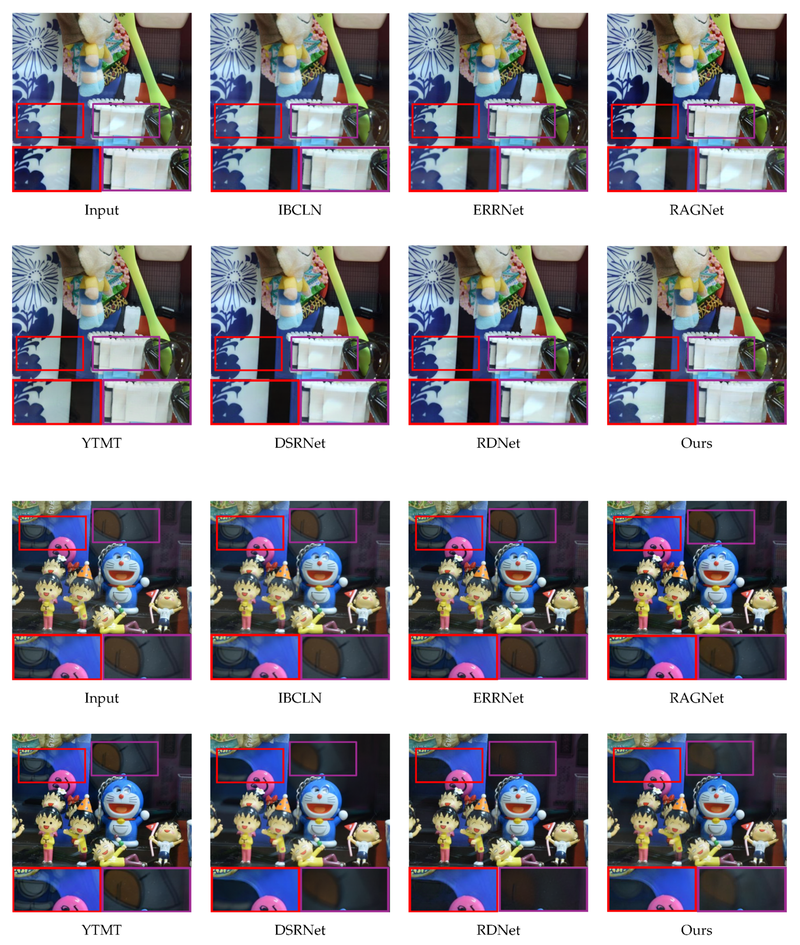 - Wen, Q.; Tan, Y.; Qin, J.; Liu, W.; Han, G.; He, S. Single Image Reflection Removal Beyond Linearity. In Proceedings of the IEEE/CVF Conference on Computer Vision and Pattern Recognition (CVPR), Long Beach, CA, USA, 16–20 June 2019; pp. 3771–3779. [Google Scholar]