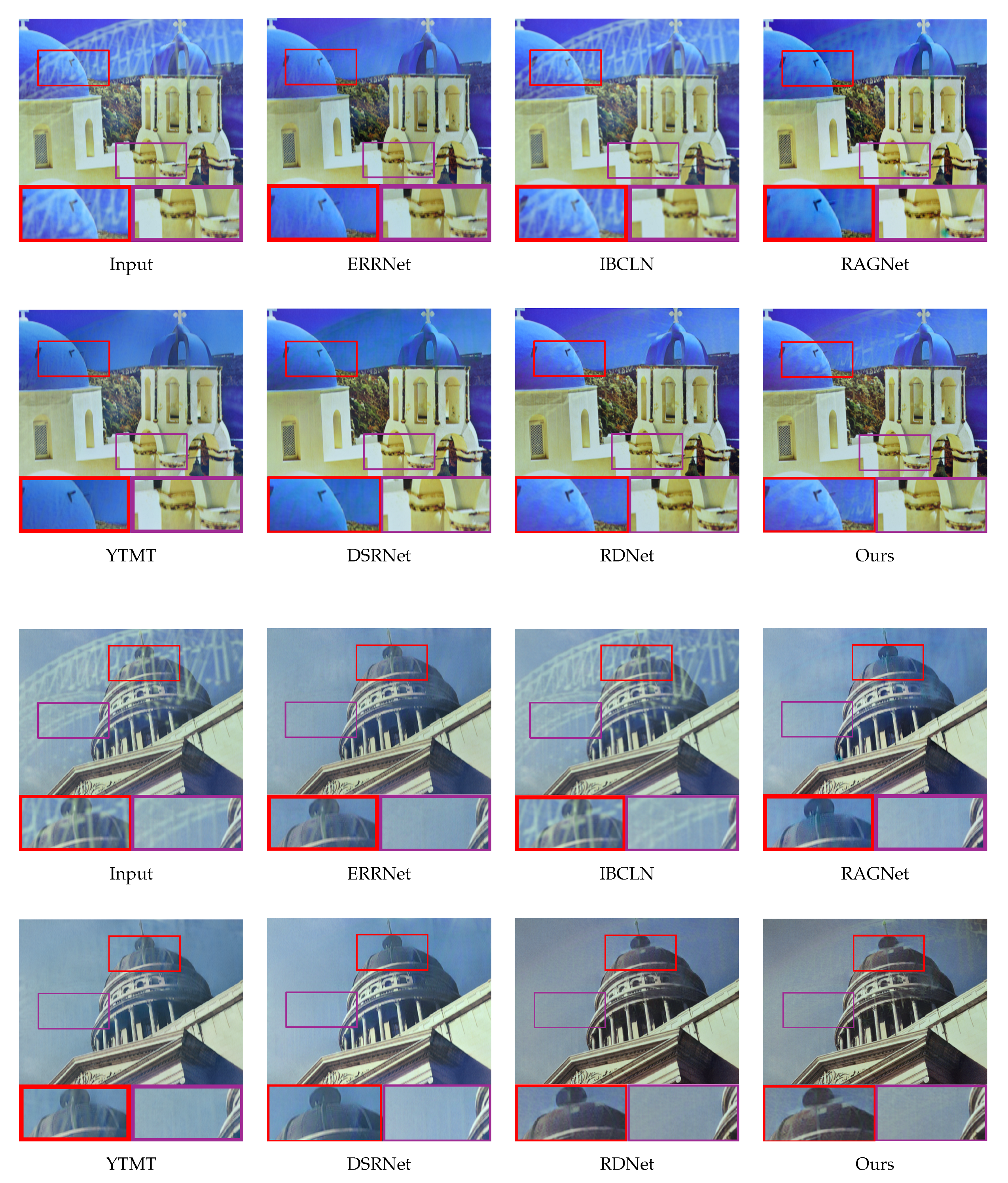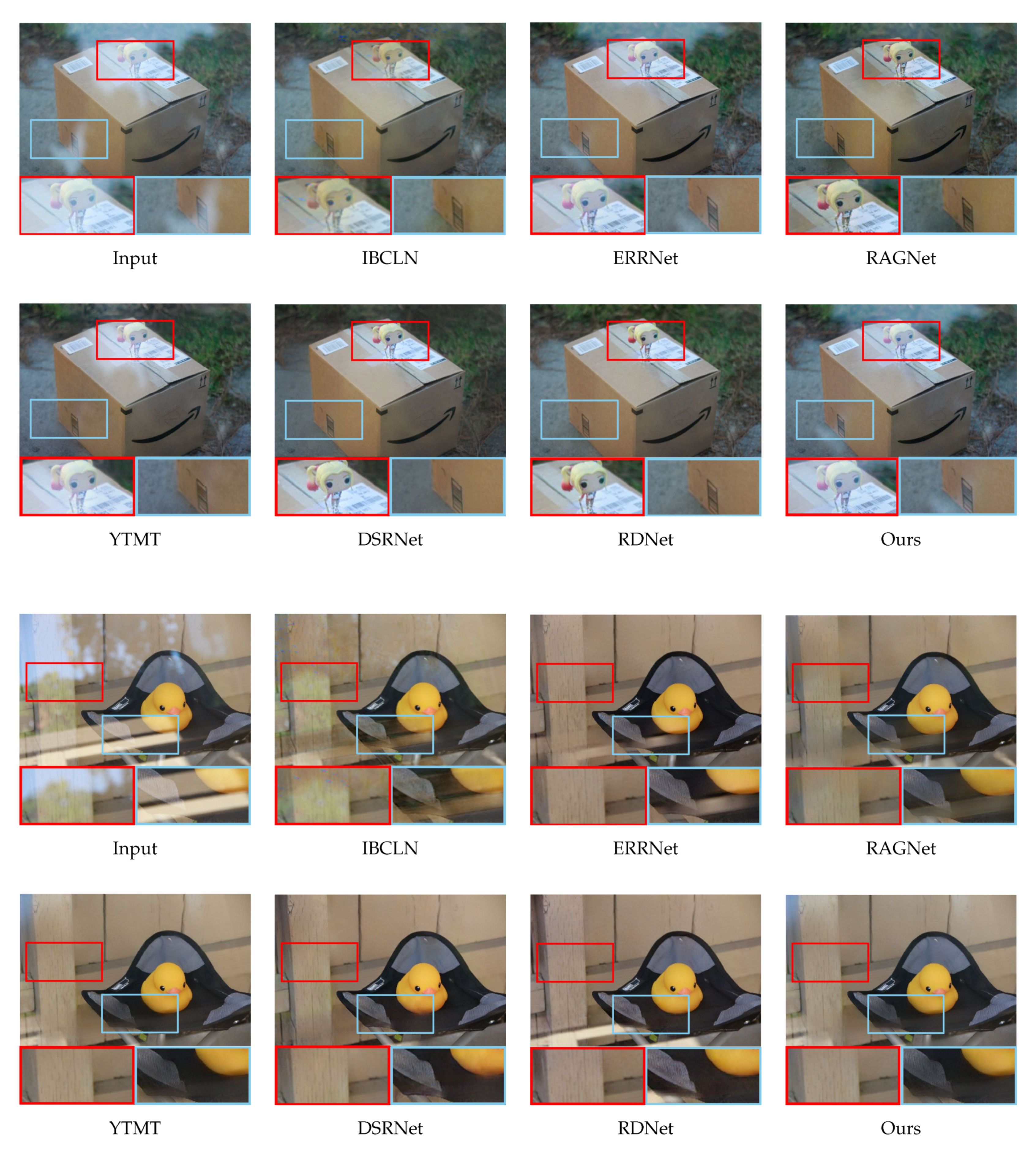 - Zhao, H.; Li, M.; Hu, Q.; Guo, X. Reversible decoupling network for single image reflection removal. In Proceedings of the IEEE/CVF Conference on Computer Vision and Pattern Recognition (CVPR), Nashville, TN, USA, 11–15 June 2025. [Google Scholar]