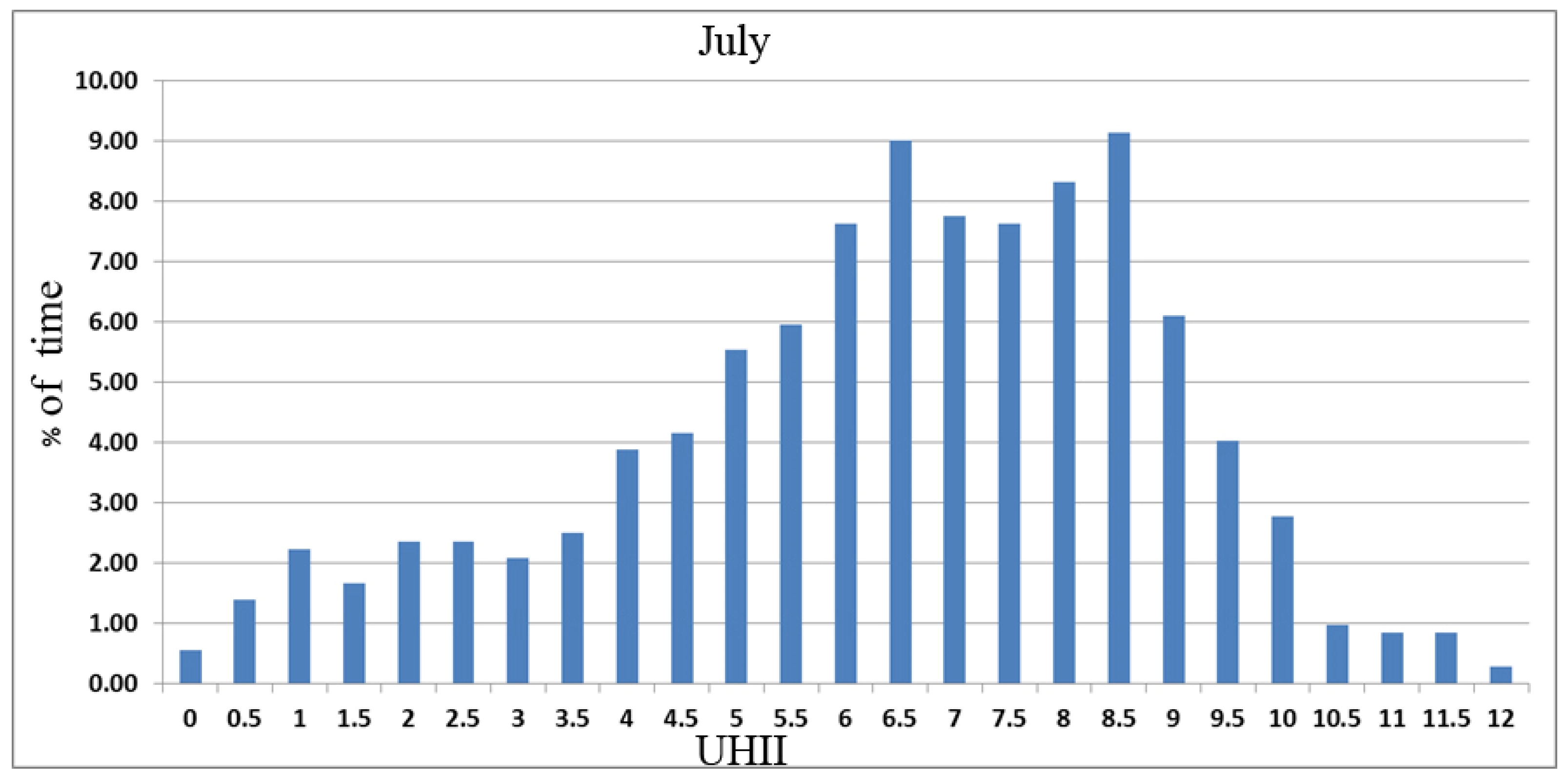 Figure 2 shows the frequency of UHII values for the month of July, when the highest temperature value was measured of 46.1 °C at a representative urban location. The maximum value of the UHII in July ranged up to 12 °C, but the largest percentage, i.e., more than 65% of the time, the value of the UHII ranged in the interval 5–9 °C. Furthermore, higher values of UHII were observed during the night period.