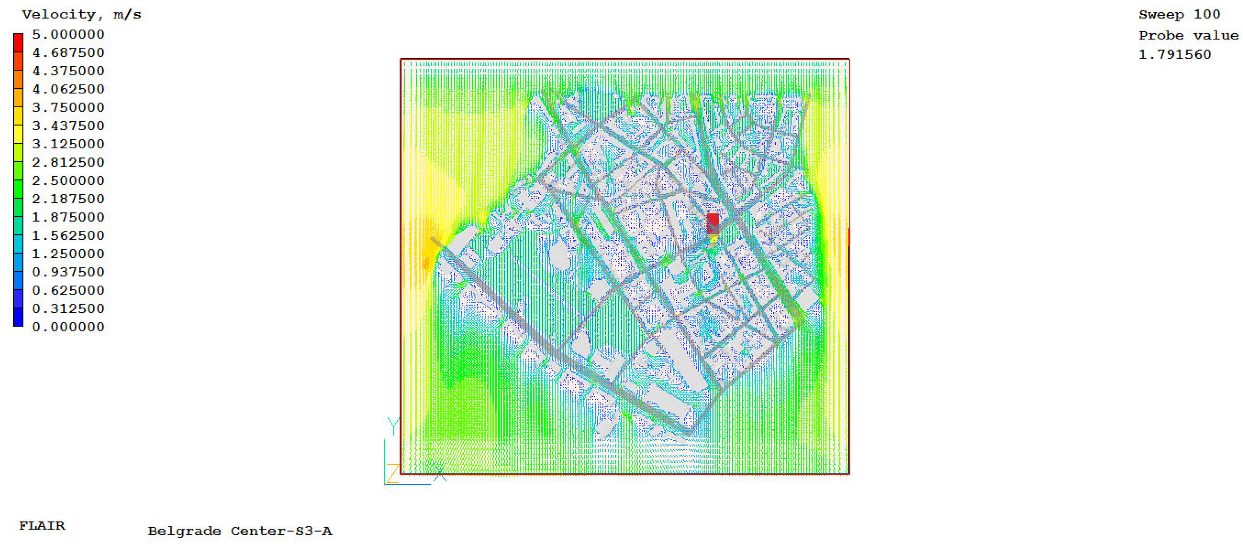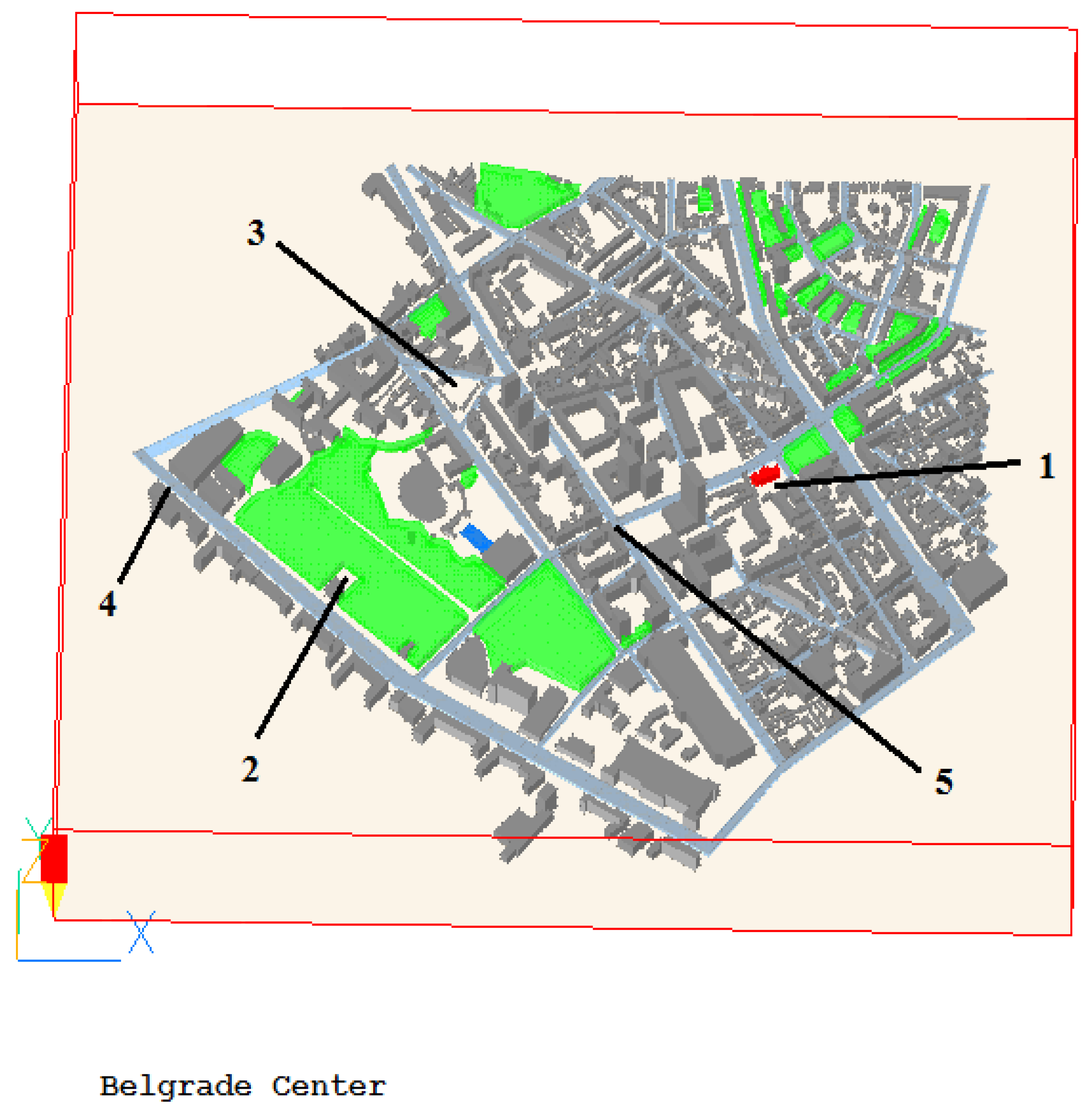 Five urban locations were selected where detailed measurements were made and marked on a three-dimensional numerical model. After creating the model geometry, the thermophysical properties of the material, boundary conditions, and numerical grid of the computational domain were defined. The number of cells in the computational grid was adjusted to help make the grid denser around the areas (buildings, streets, parks) that are the subject of this research, so that the flow in the immediate vicinity around the buildings could be determined with satisfactory accuracy. Graphical representations of the three-dimensional numerical model and the convergence flow processes for cases S1-C, S2-C and S3-C are given in