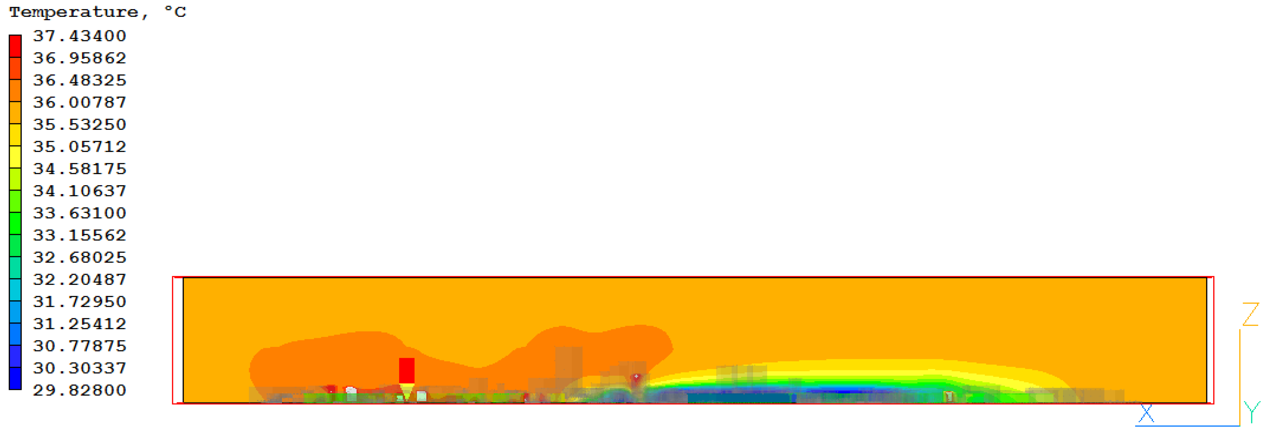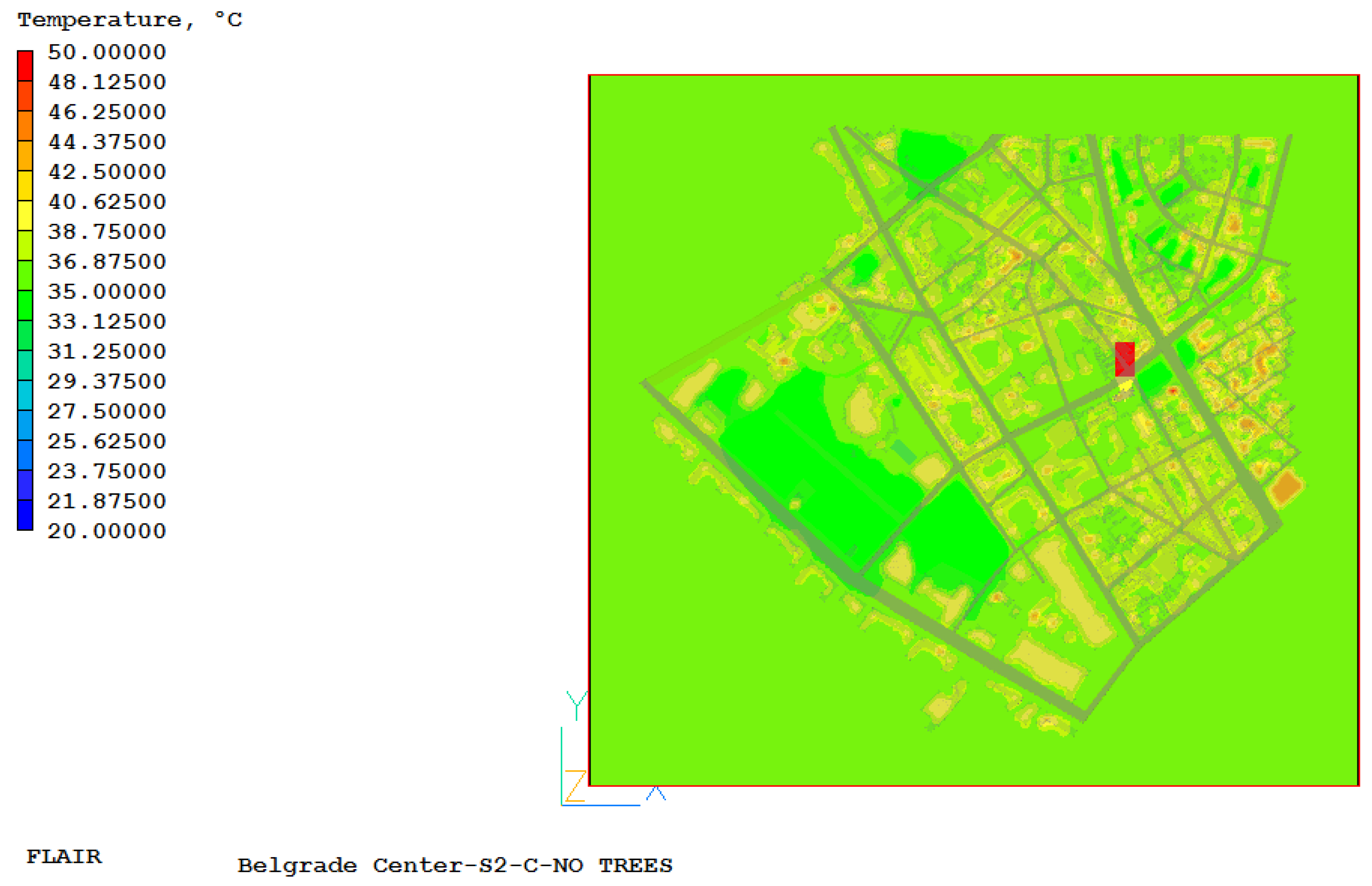 Figure 3 shows the air temperature field at a height of 1.85 m for the case S2-C-NO TREES.