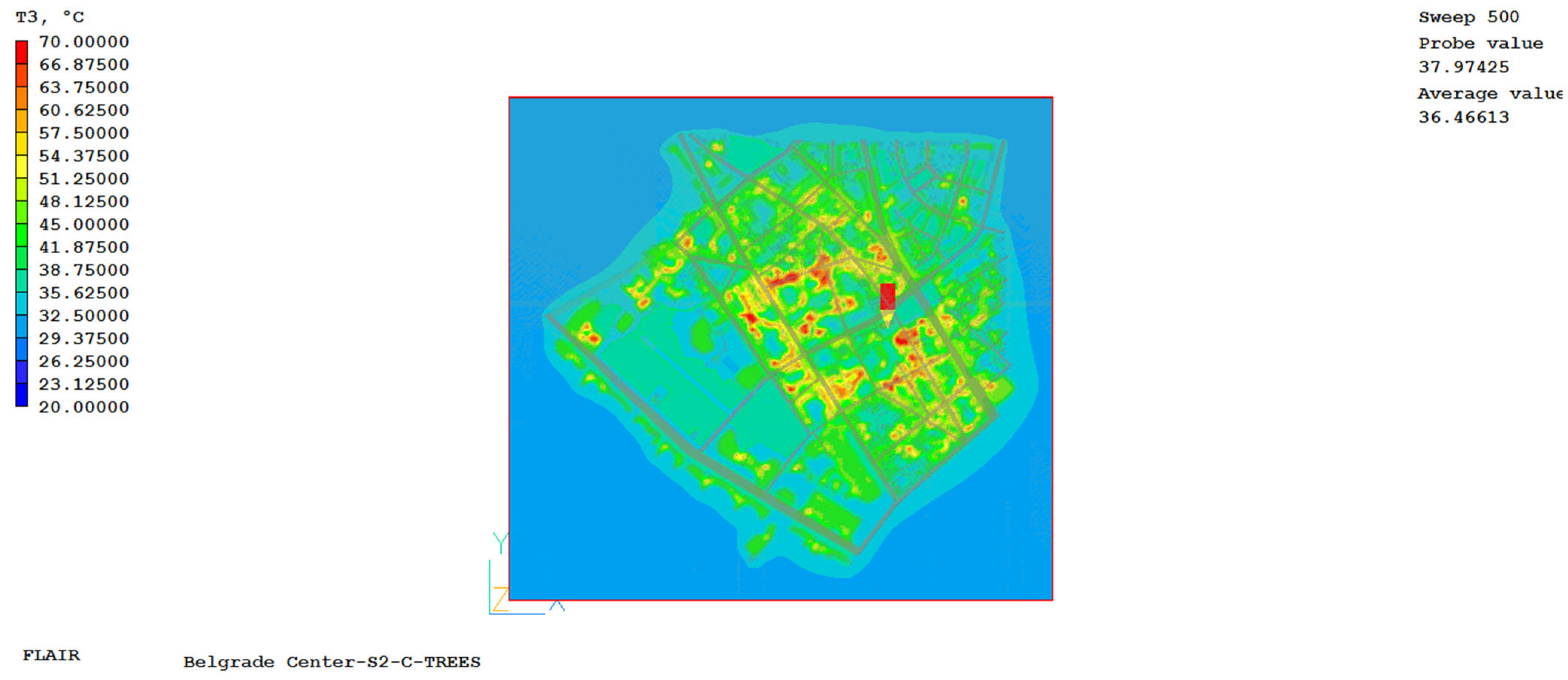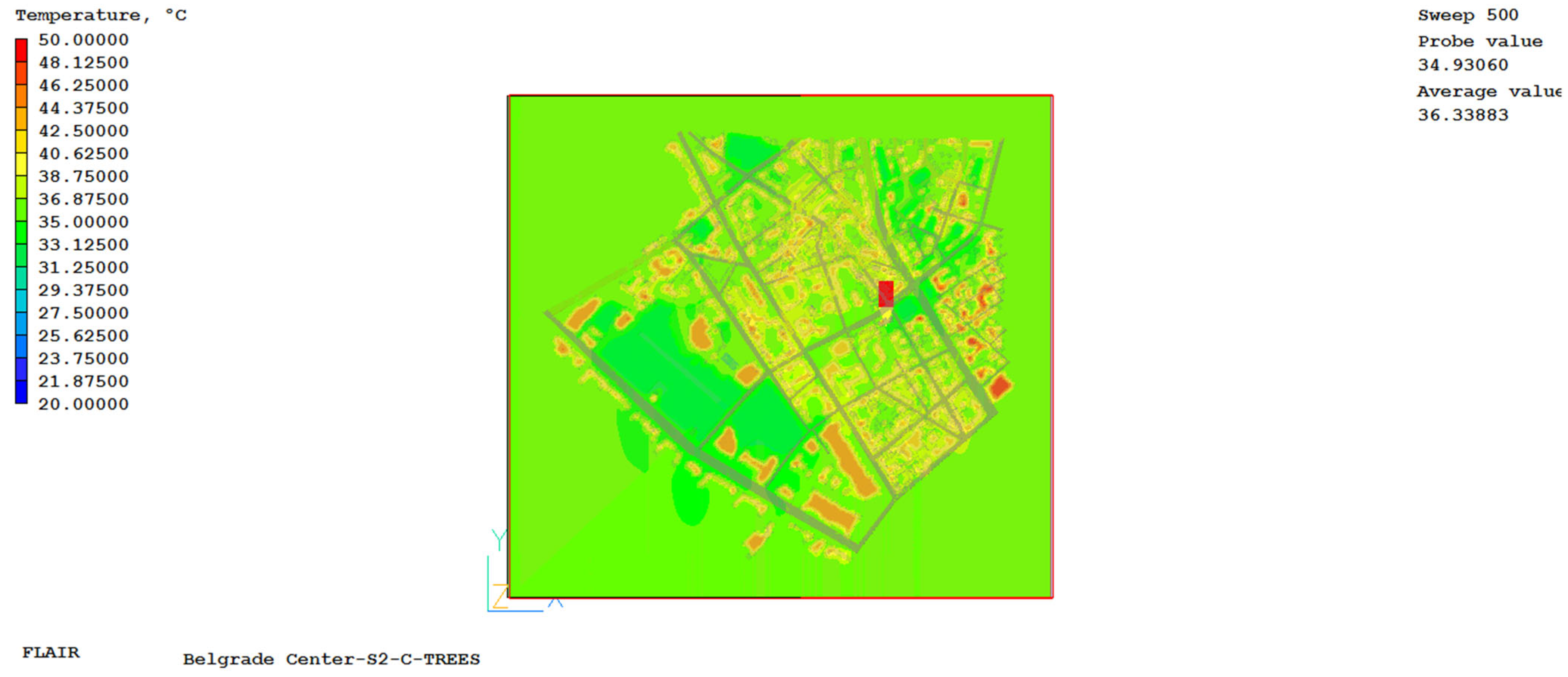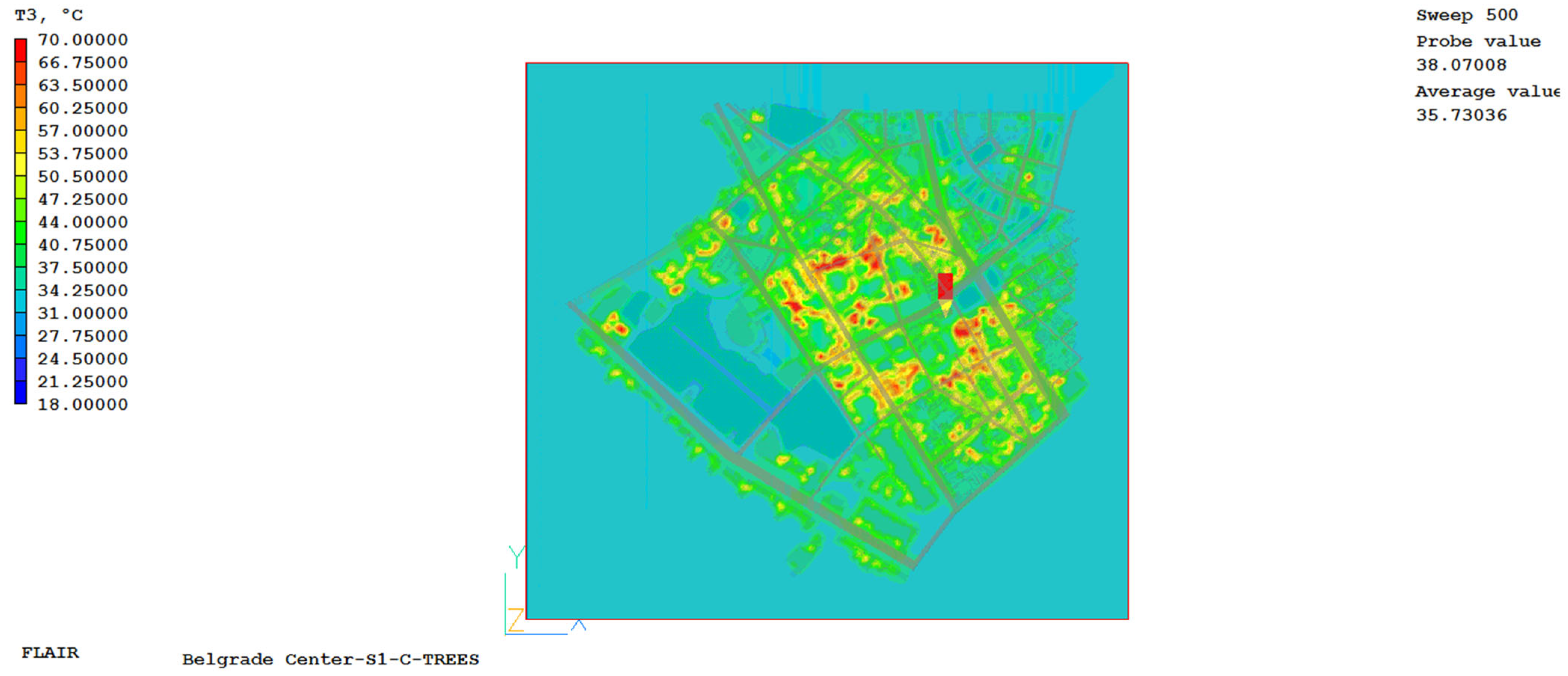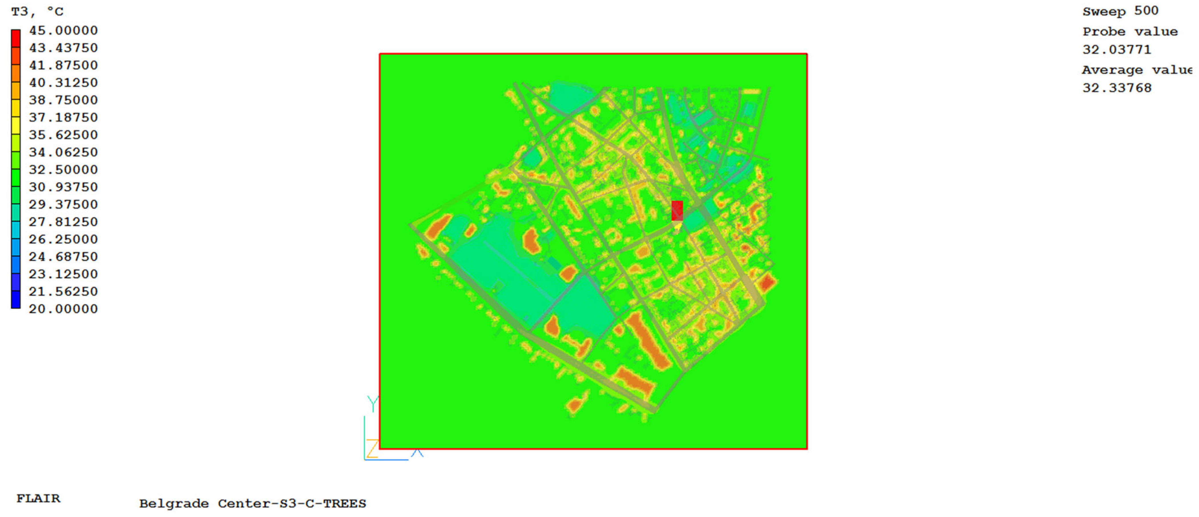 Appendix C, clearly show the difference between the two urban environment structures consisting of buildings and other similar objects that have high heat absorption and a large area covered by vegetation. In the part of the city where there are only buildings, the air temperature is higher and a heat island is created at the city level. This directly results in an increase in temperature in those parts of the city, which further negatively affects external thermal comfort, but also leads to higher energy consumption for cooling the interior of those buildings. In the observed urban area, the area under vegetation occupies 8.5% of the total area. In the case of no vegetation, the average outdoor ambient temperature of the observed domain increases from 2% in the morning to 4% in the evening.