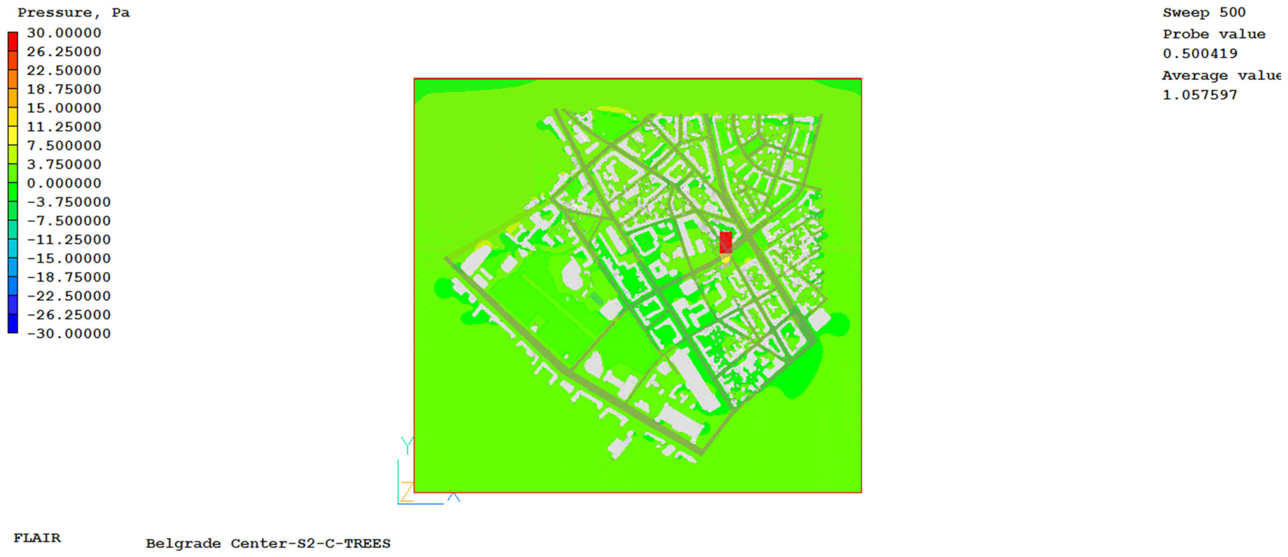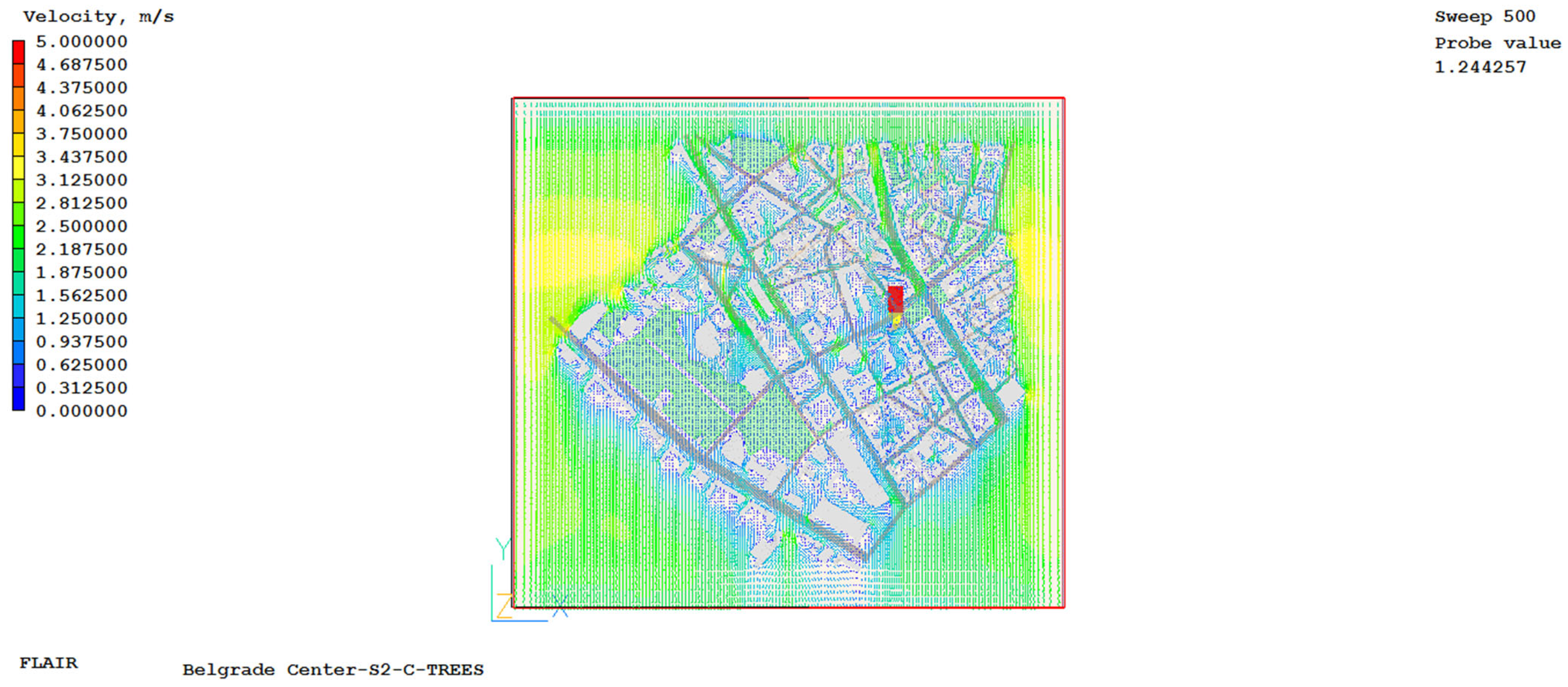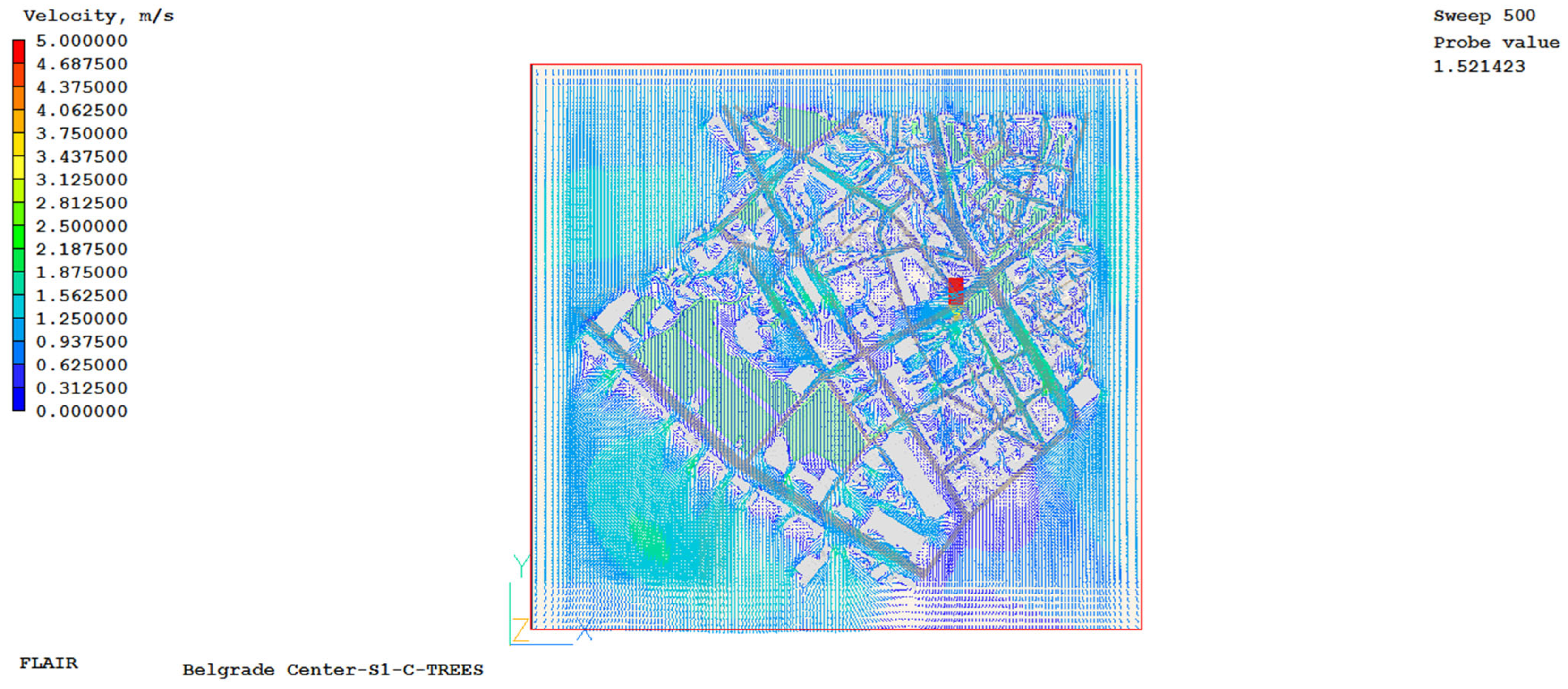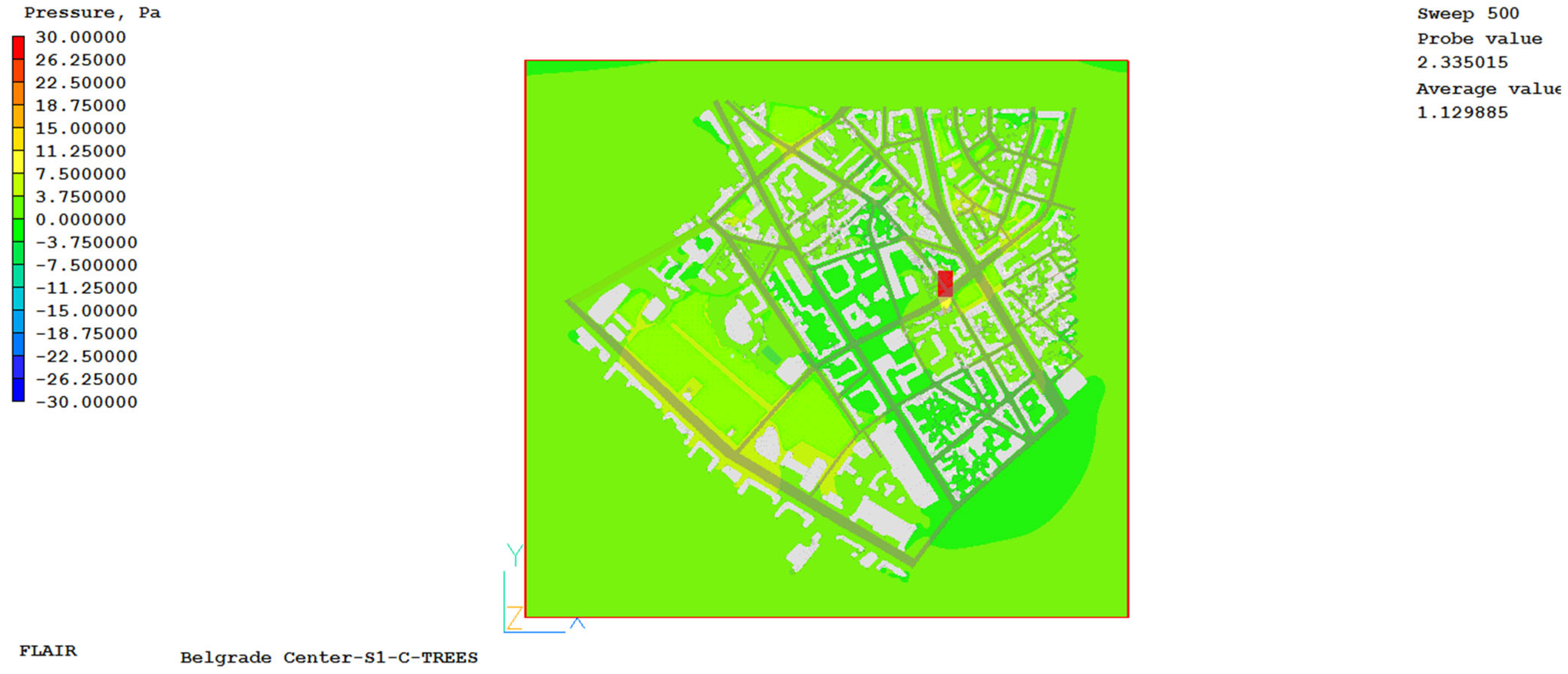 Appendix C, clearly show the difference between the two urban environment structures consisting of buildings and other similar objects that have high heat absorption and a large area covered by vegetation. In the part of the city where there are only buildings, the air temperature is higher and a heat island is created at the city level. This directly results in an increase in temperature in those parts of the city, which further negatively affects external thermal comfort, but also leads to higher energy consumption for cooling the interior of those buildings. In the observed urban area, the area under vegetation occupies 8.5% of the total area. In the case of no vegetation, the average outdoor ambient temperature of the observed domain increases from 2% in the morning to 4% in the evening.