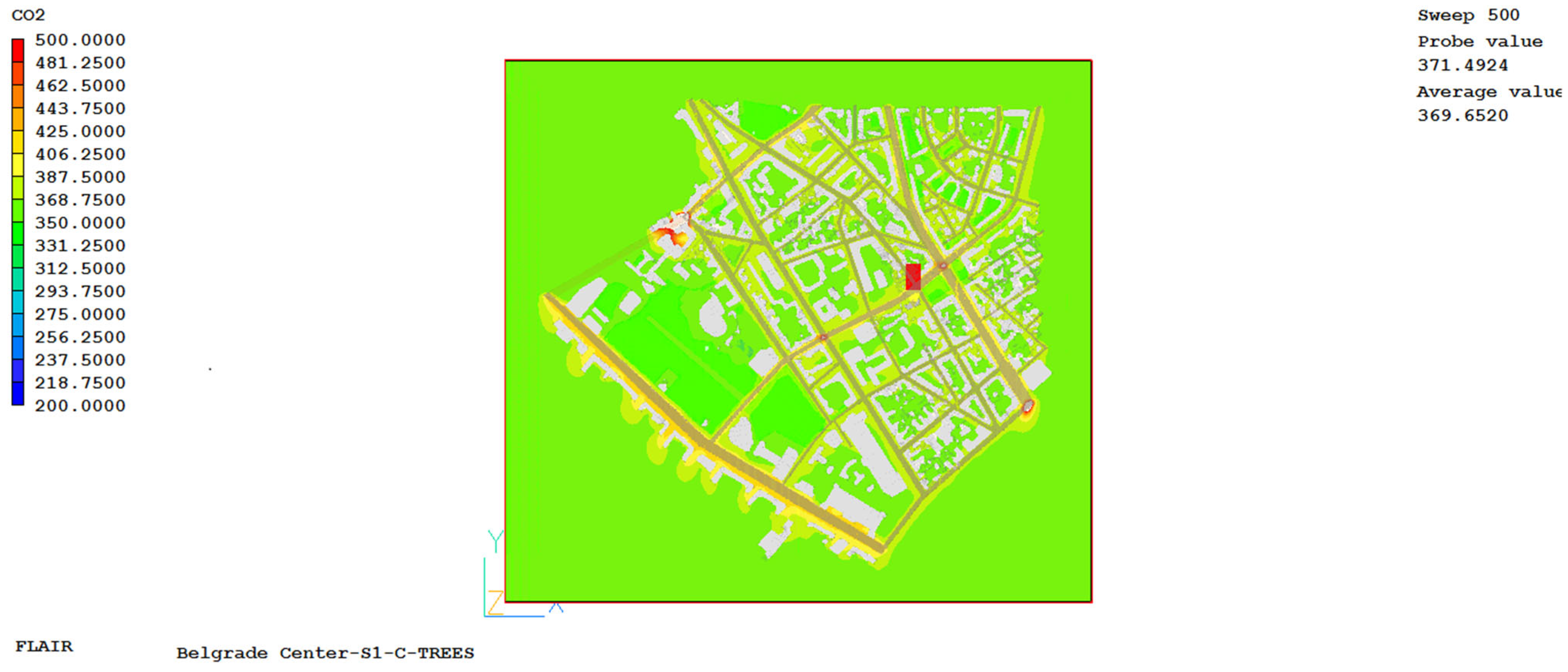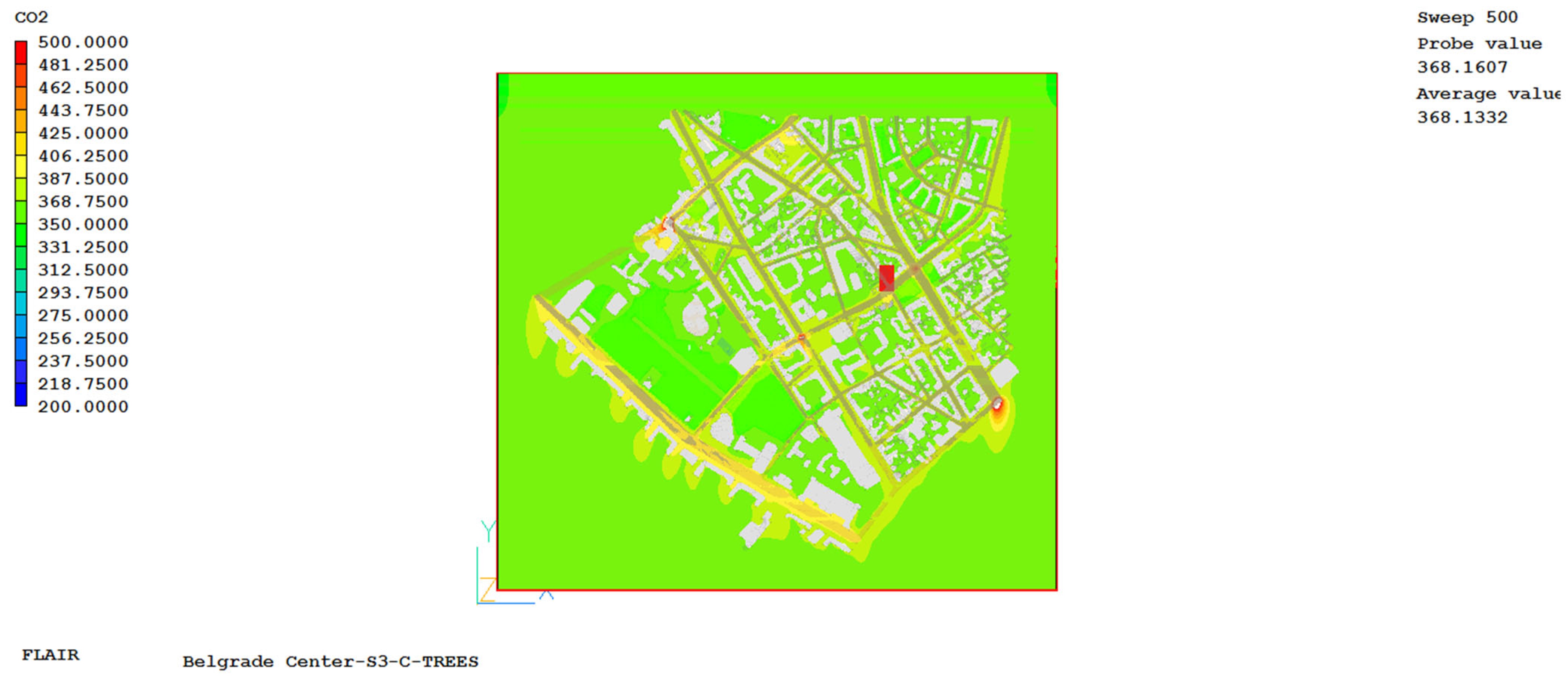 This paper demonstrates the advantage of using numerical software for detailed characterization of current-thermal quantities and dispersion of a non-reactive pollutant (carbon dioxide). As the model for the selected complex urban environment of the city of Belgrade showed high accuracy, agreement of simulated and measured data, for the assessment of current fields and carbon dioxide concentration fields, it can be considered that this model is a useful tool for assessing the impact of other pollutants on the urban environment. Also, this numerical–mathematical model can be easily applied to other urban environments. Given that this is a very complex urban geometry, the size of the selected and calculated domain is large, and the difference between the obtained simulated and measured values is below 5%, it can be considered that the model met the goal and provided a realistic estimate of the observed parameters.