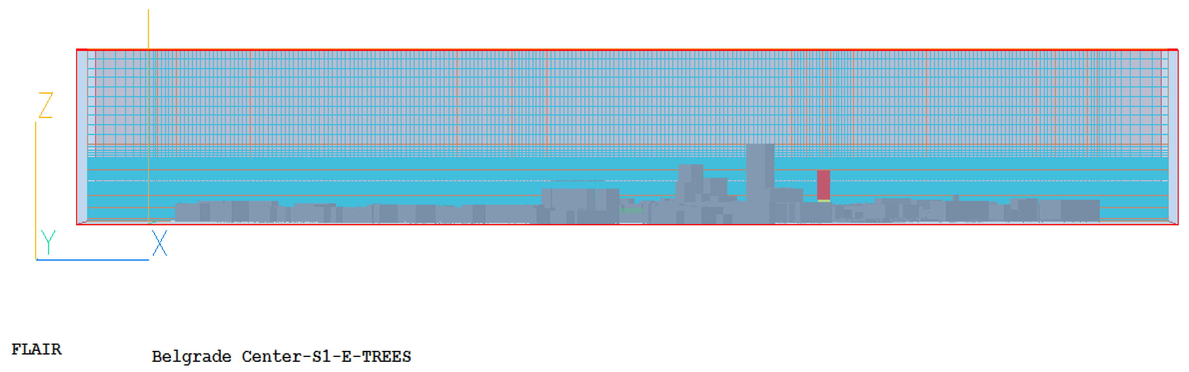The numerical simulations were carried out using the commercial CFD software CHAM PHOENICS (version PHOENICS 2015-19), which is based on the Finite Volume Method (FVM). The flow was considered steady, justified by the short, 1 h intervals simulated, during which temporal changes in atmospheric parameters are minimal. Turbulence model: The standard two-equation k-ϵ (epsilon) model was used to represent the turbulent flow regime, which is suitable for atmospheric boundary layer simulations [