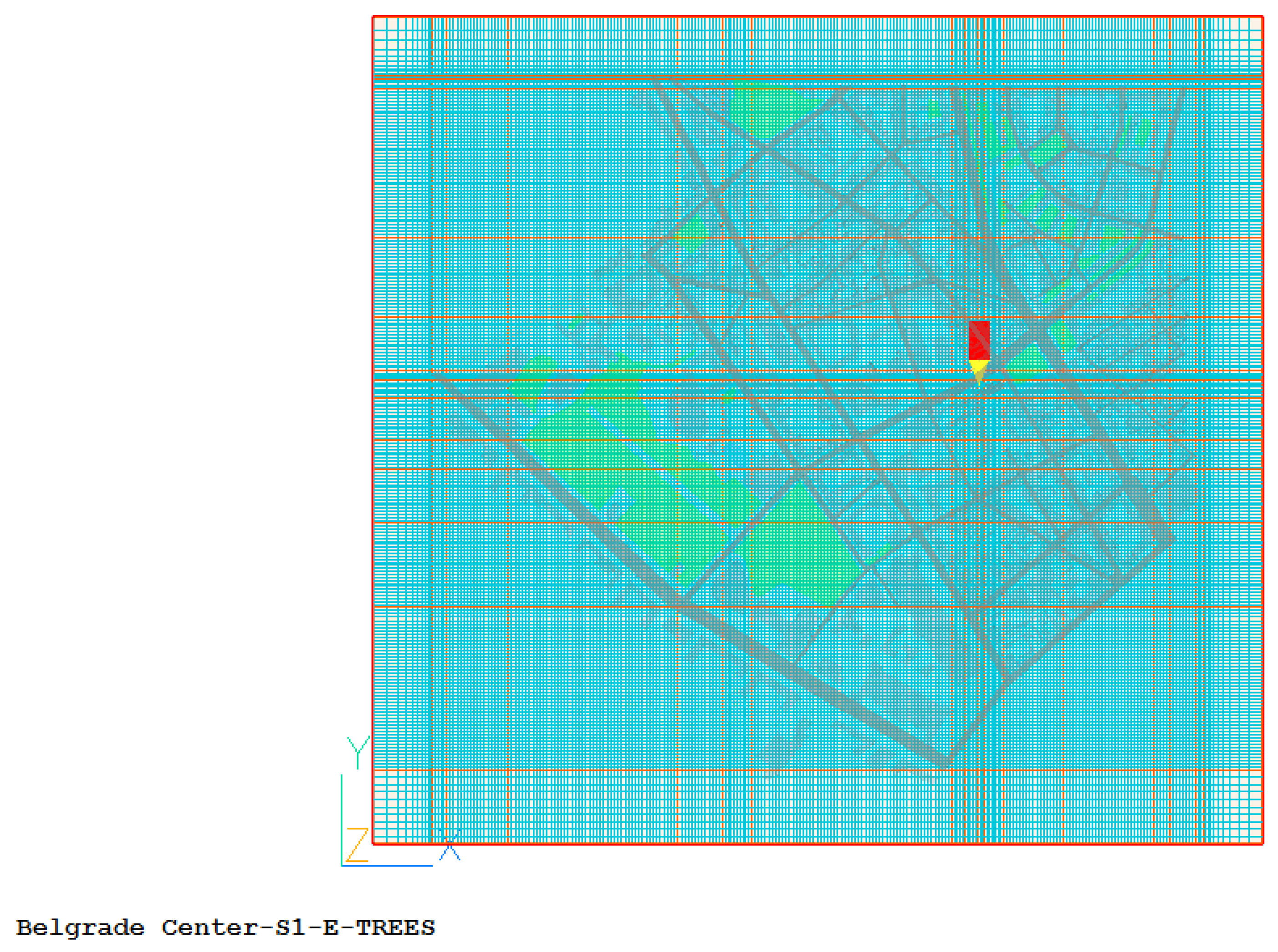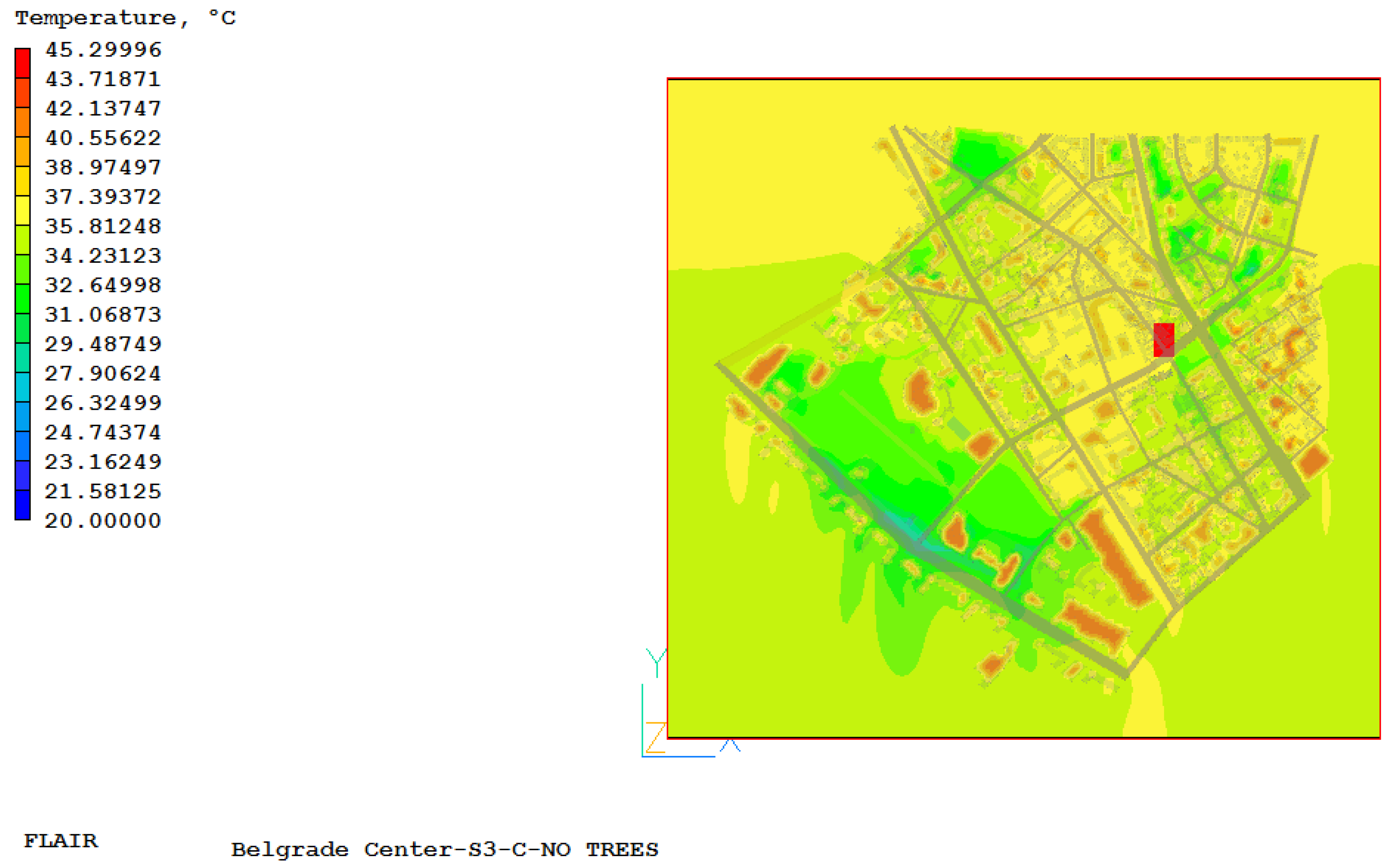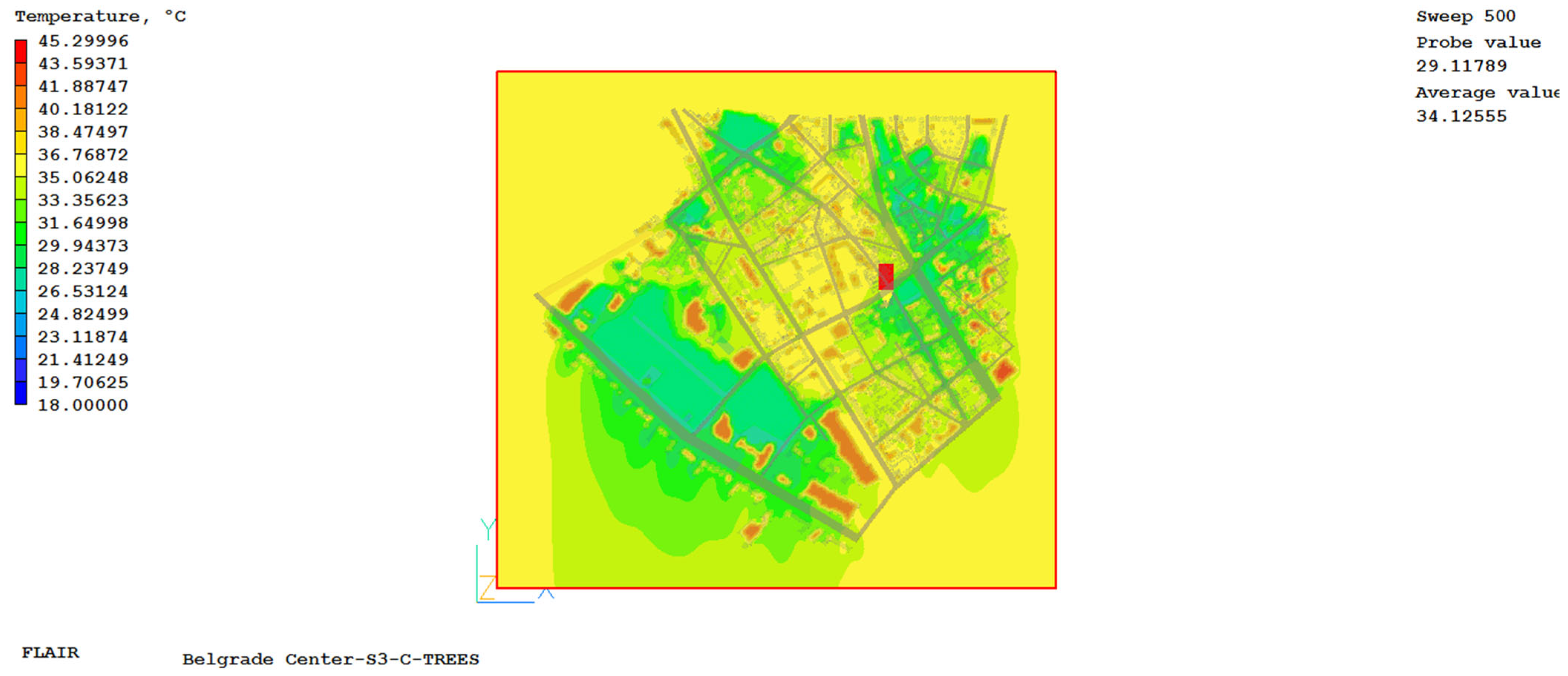 Appendix C, the simulation values in the case where there were trees are shown in green. Based on all of the above, it can be concluded that trees greatly affect the air temperature in the urban environment, and therefore the UHII and the energy needs of buildings located in that area. Based on numerical simulations, with and without trees in the urban environment, it can be concluded that the presence of trees in the urban environment significantly affects the temperature in the vicinity of parks and larger areas where trees are located. With a detailed analysis based on
