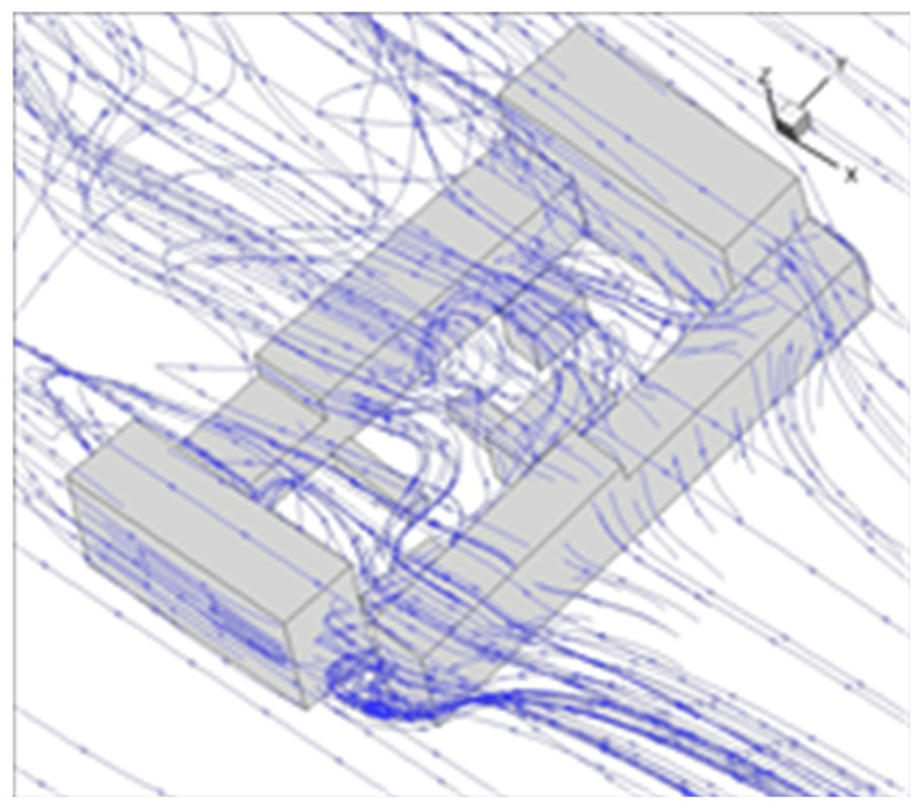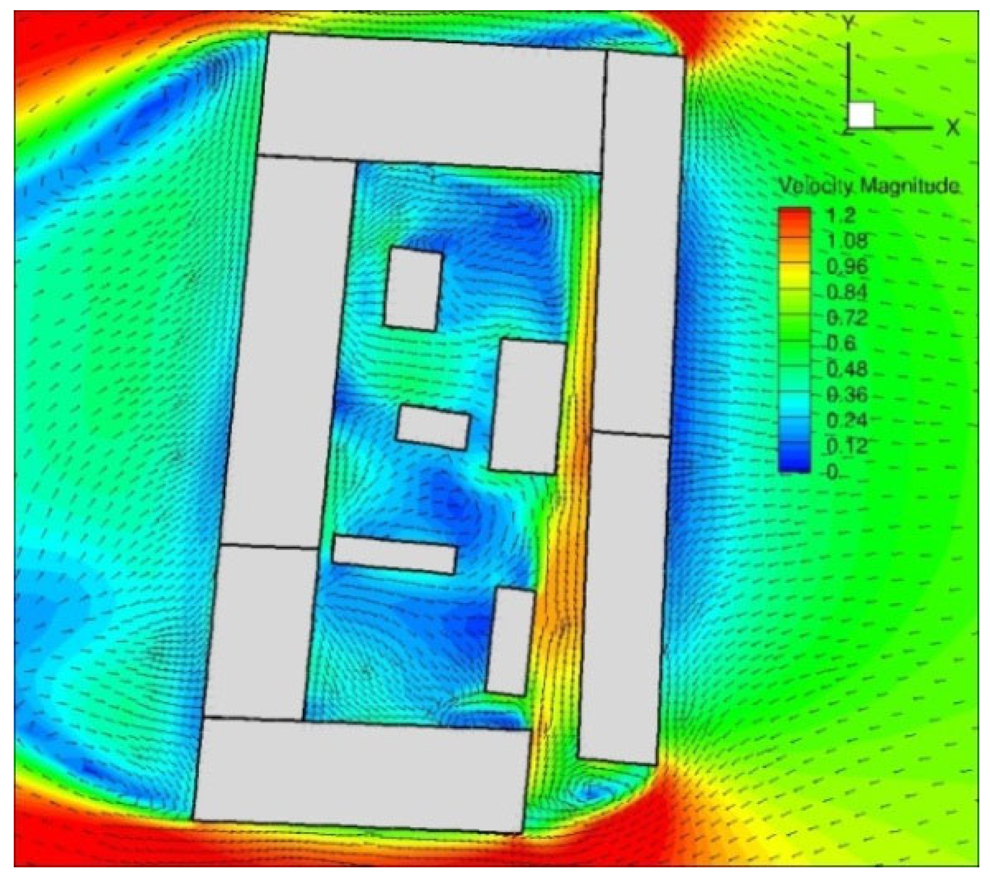Given the good agreement between experimental and numerical results, the influence of wind on the local value of the external air temperature was analyzed using the example of a closed block of buildings from the observed urban environment, located in the immediate vicinity of a meteorological station placed on a school building. A detailed analysis of the flow field results inside a closed block of buildings showed that the negative effect leading to an increase in temperature in the blocks themselves is the appearance of quasi-stationary vortex structures. It has also been shown that the development of horizontal vortex zones is caused by the presence of lower buildings within a closed building block, as can be seen in