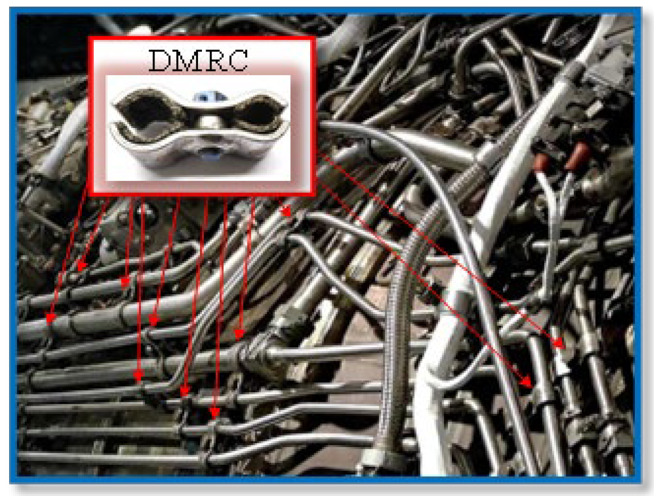 The pipeline system of aero-engines can generate complex vibrations under the combined excitation of multiple loads, and prolonged excessive vibrations can lead to premature fatigue failure of the pipe [1,2,3]. Metal rubber clamps are important pipe connection and support components, and their mechanical properties seriously affect the vibration characteristics of the pipe systems [4,5,6]. Compared to other types of clamps, dual metal rubber clamps (DMRCs) are mainly used to connect parallel pipelines (the diameters of the two pipelines may be different), and the proportion of DMRCs in quantity is relatively large (as shown in Figure 1). Therefore, the mechanical properties of a DMRC have a great impact on the dynamic characteristics of the pipeline system. In order to accurately analyze the structural dynamics, vibration characteristics, vibration reduction optimization, and fault diagnosis of pipeline systems, it is particularly important to accurately obtain the mechanical performance parameters of DMRCs.