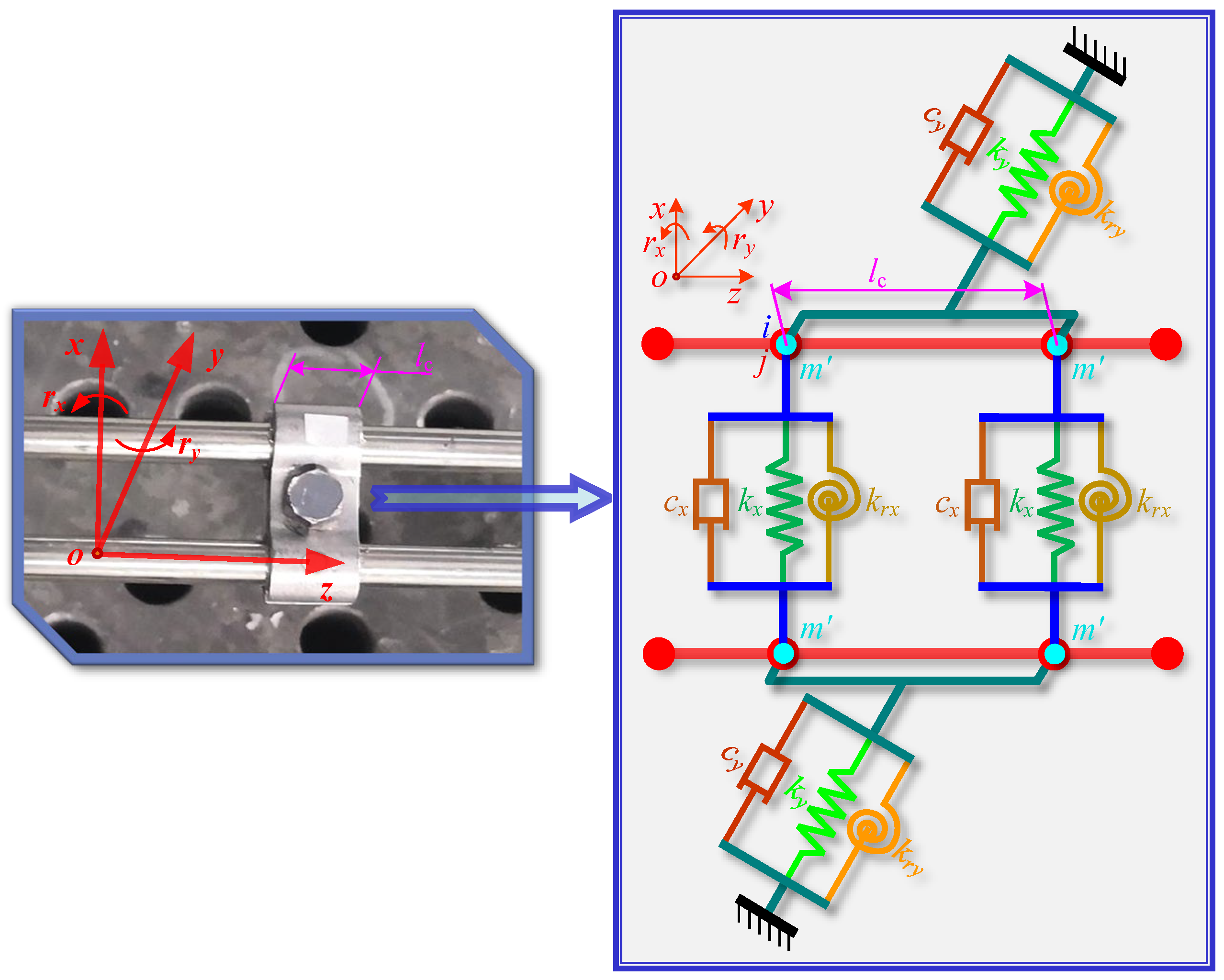 The stiffness matrix K cl and damping matrix C cl of the clamp corresponding to the constitutive model constructed in Figure 4 are shown in Equations (4) and (5).