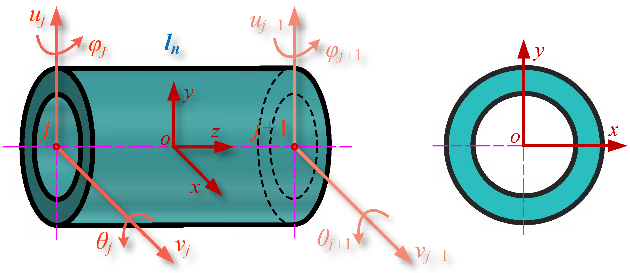 The axial translational and torsional deformations of the pipe are ignored, and Timoshenko beam elements are used for dynamic modeling. As shown in Figure 5, the coordinate system of a certain pipe element is o x y z , and l n is the length of the n -th pipe element. The displacement vector of the j -th node and ( j + 1 ) -th node can be expressed as follows [17]: