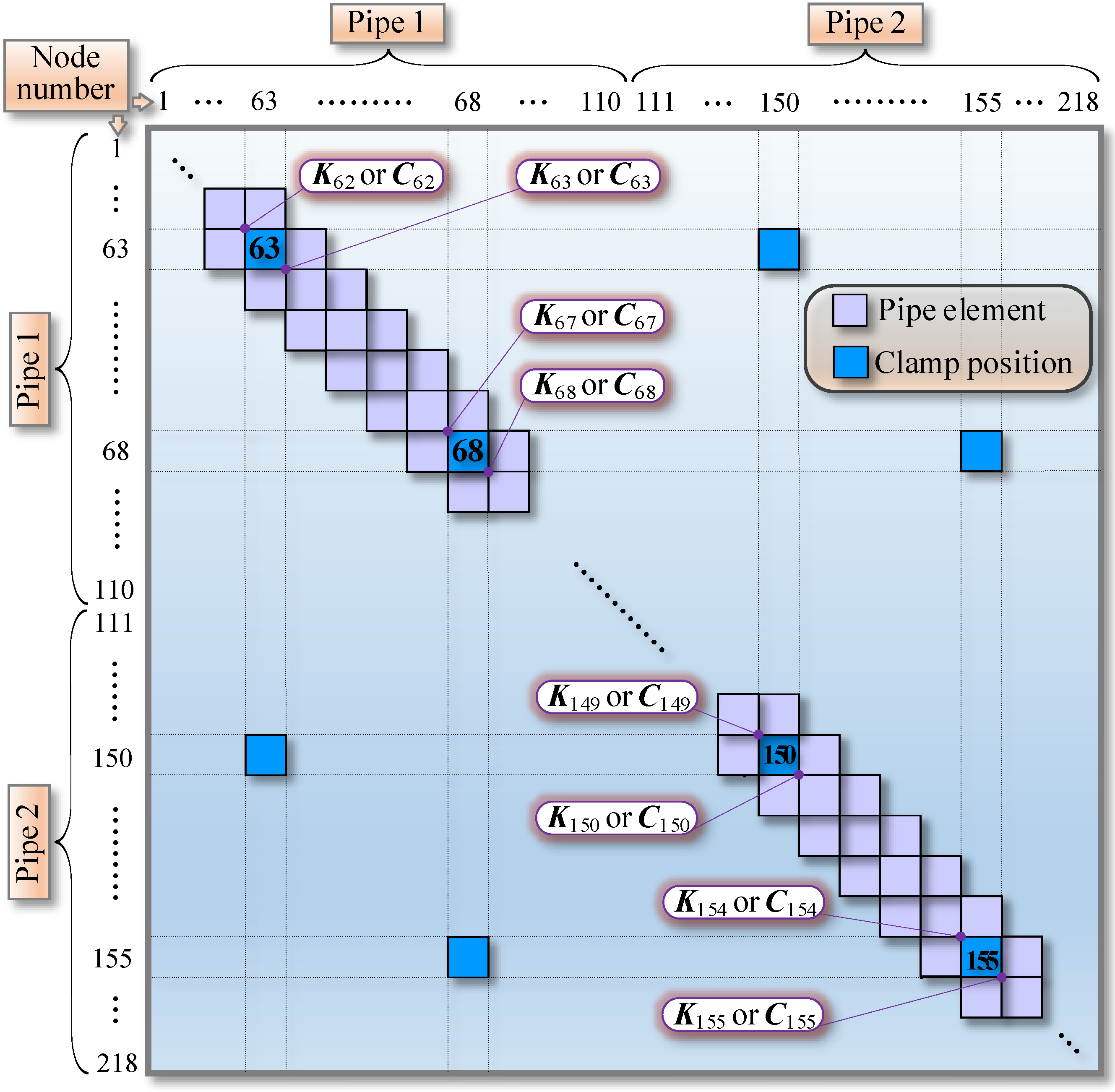 Figure 7. The method for assembling the stiffness matrix and damping matrix of the DMRC-pipeline system.