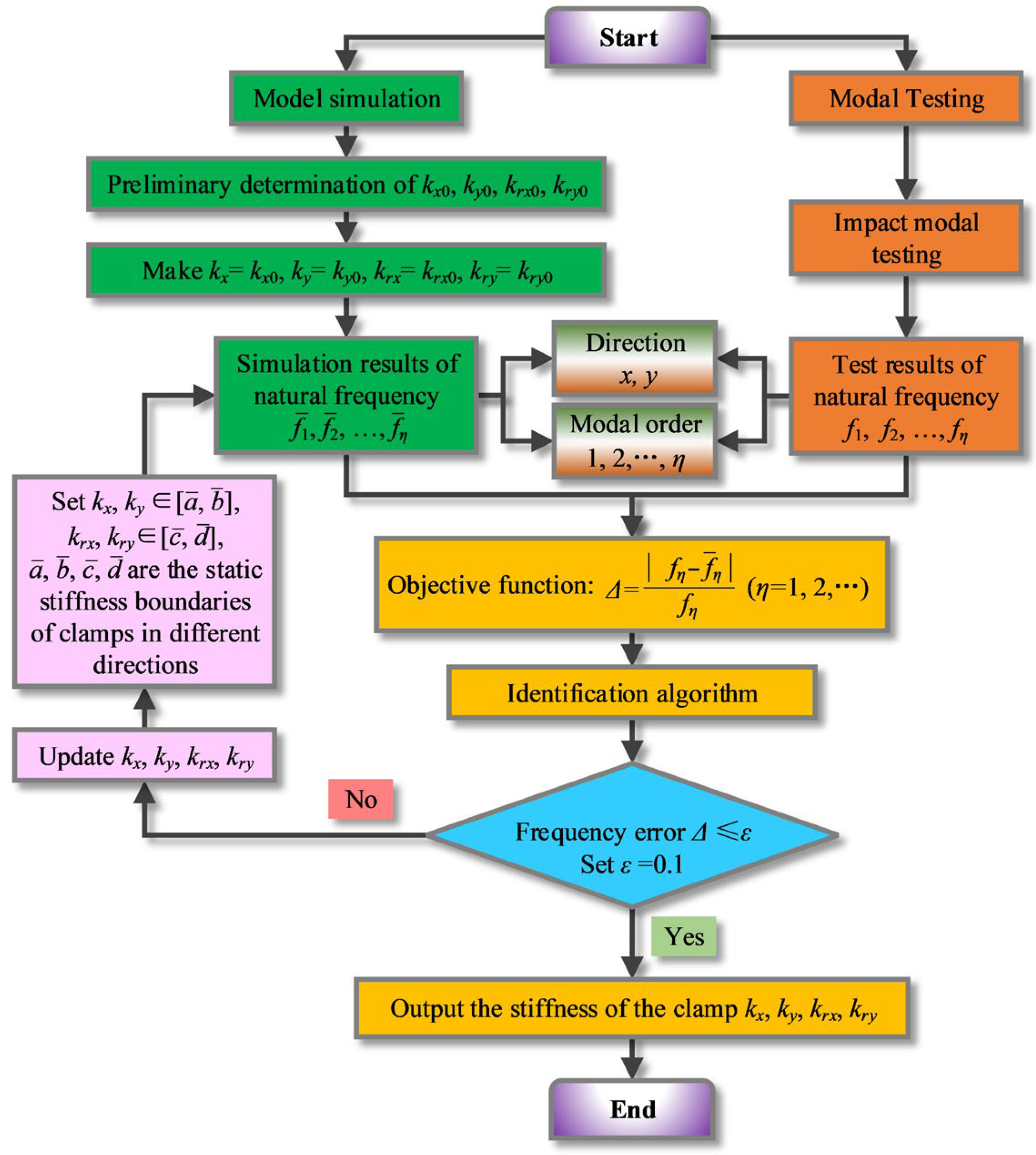 where f η , f ¯ η respectively represent the natural frequencies of the η -th order obtained from modal testing and simulation. Here, the algorithm objective function is constructed based on the deviation between the natural frequencies obtained from simulation and testing. The constraint conditions are set as the variation ranges of the clamp stiffness k x , k y , k r x , k r y , where the boundary of variation a ¯ x , b ¯ x , a ¯ y , b ¯ y , c ¯ r x , d ¯ r x , c ¯ r y , d ¯ r y is determined by static experiments. The identification procedure of clamp stiffness is shown in Figure 8.