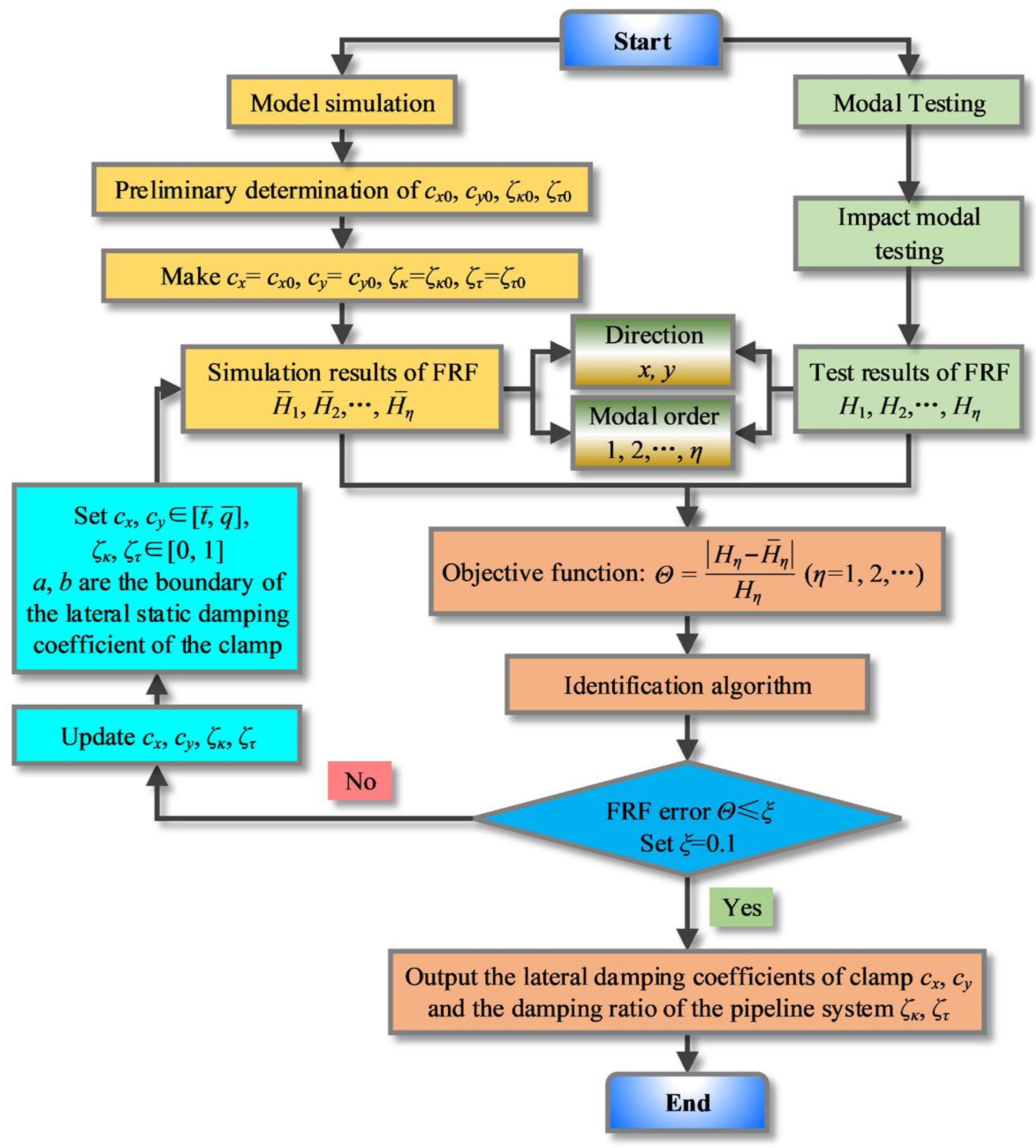 The FRF of the pipeline system is directly affected by the damping of the clamps. Herein, the clamp damping is identified based on FRFs of each order obtained by modal testing and simulation. The identification algorithm for clamp damping is as follows: