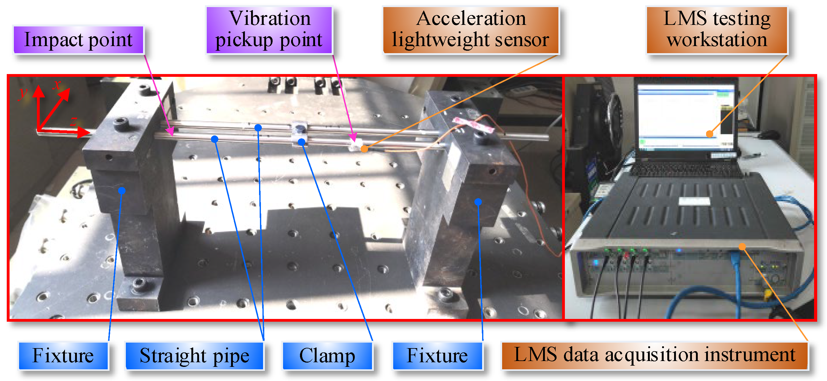 The experimental system is shown in Figure 10, and modal testing is conducted using the impacting method. An impacting hammer is used to shock the pipe, and a single-axis PCB accelerometer is used for vibration pickup. The acceleration responses in the x and y directions are tested separately. Vibration signals are processed by the LMS data acquisition instrument and transmitted to the LMS testing workstation. The modal data (natural frequencies and FRFs) of the system are obtained through analysis using LMS testing software (version: 2021). The testing equipment used is listed in Table 2.