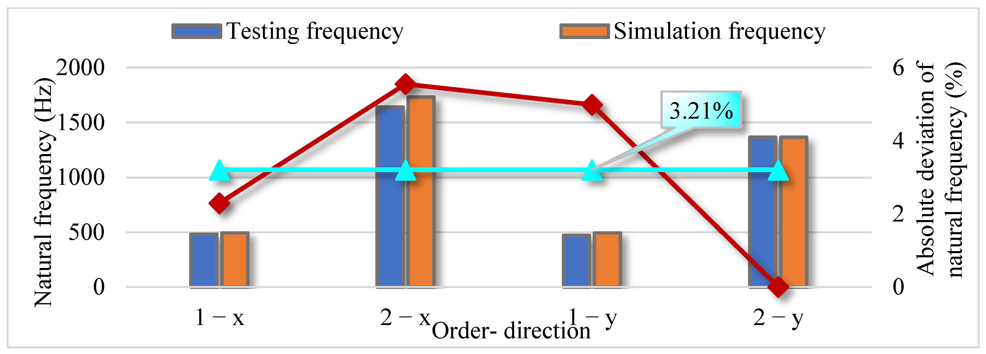 Figure 13. Natural frequencies and frequency deviations of testing and simulation.