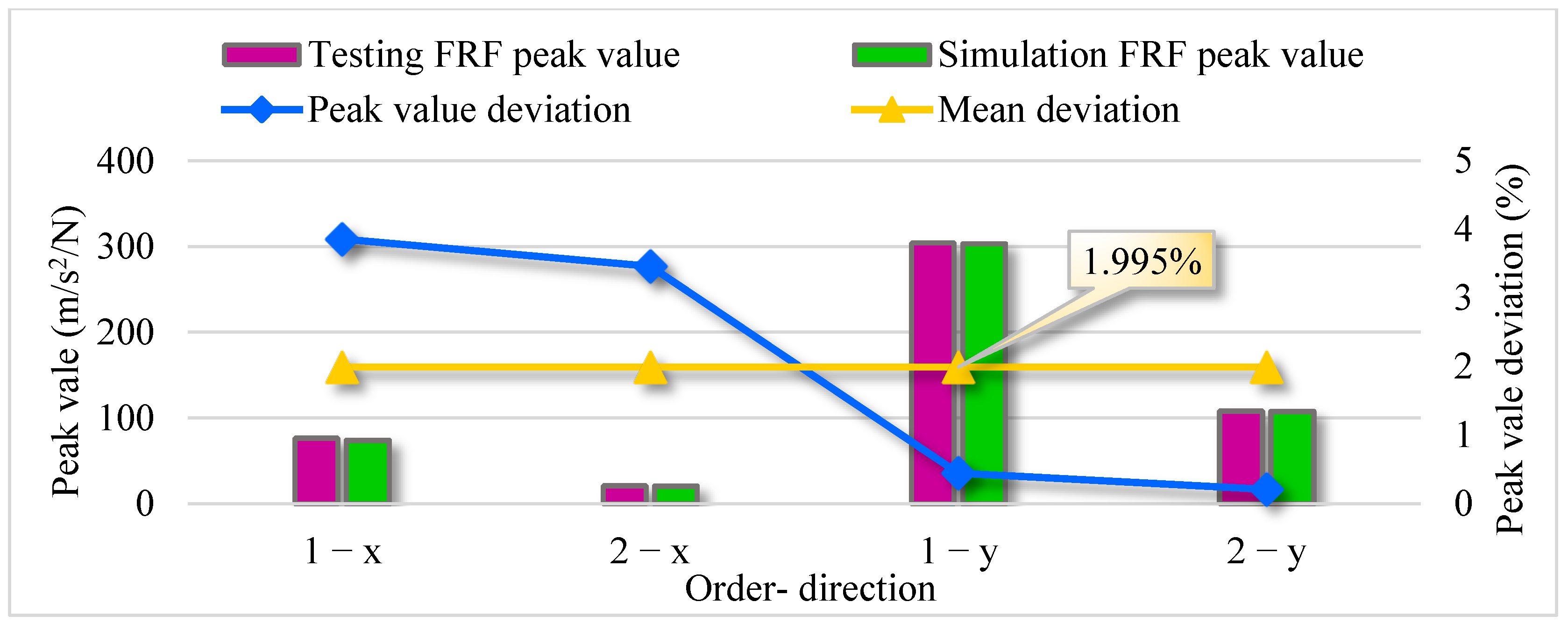 Figure 15. FRF peak value and peak value deviations of testing and simulation.