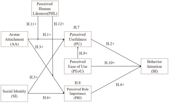 This study proposes an integrated framework in which the TAM’s core predictors (PU and PEOU) are influenced by avatar-related factors (AA) and SI. For instance, users who strongly identify with a mourning group and feel attached to their avatars may perceive the memorial platform as more emotionally useful, even if it lacks optimal usability [37,38].