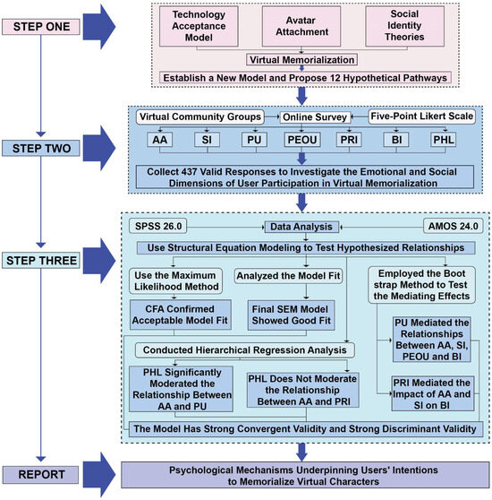As shown in Figure 2, this study applies TAM, AA, and SIT to virtual memorialization, proposing 12 hypothetical pathways and developing a scientific model through empirical research to explore the psychological mechanisms underlying user participation in virtual memorial activities. Research data were collected from online communities, yielding 437 valid responses, which were measured on a five-point Likert scale. The data analysis was conducted using SPSS 26.0 and AMOS 24.0, followed by mediation tests and moderation analyses. The results indicated that the structural model exhibits strong convergent and discriminant validity.