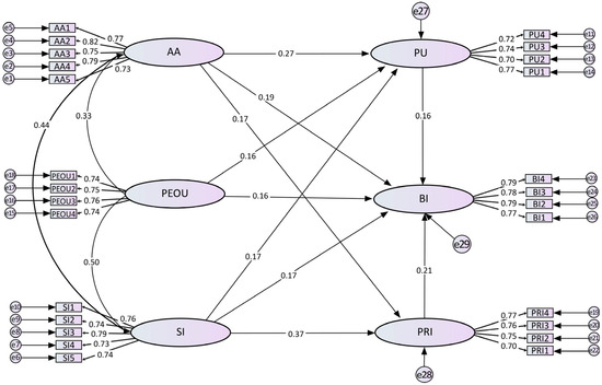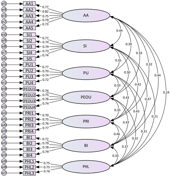 This study conducted a confirmatory factor analysis (CFA) using AMOS 24.0 to assess the measurement models of the following constructs: AA, SI, PU, PEU, PRI, BI, and PHL (Figure 3). The analysis evaluated the structures of these multi-item scales and assessed the convergent validity of each construct through composite reliability (CR) and average variance extracted (AVE).