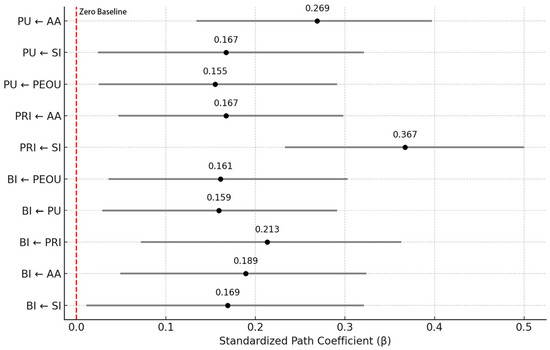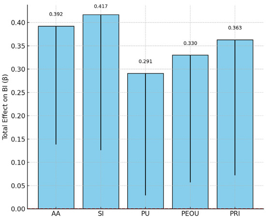 Structural model testing (RQ1): The direct pathways hypothesized between AA, SI, PU, PEOU, PRI, and BI were tested using SEM. This step evaluated the core relationships in the extended TAM.