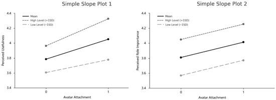 Moderation analysis (RQ3): Hierarchical regression was conducted to test the moderating effects of PHL on the AA → PU and AA → PRI pathways. This step evaluated whether anthropomorphic features strengthen or weaken the translation of Avatar Attachment into perceived system value or role significance. To test for potential multicollinearity, variance inflation factors (VIFs) and tolerance values were calculated for both construct-level and item-level predictors. All construct-level VIFs ranged from 1.177 to 1.478 (Tolerance = 0.677–0.850), and item-level VIFs ranged from 1.757 to 2.414, well below the conventional threshold. These results suggest that multicollinearity is unlikely to bias the moderation analyses (see Table A1 for details).