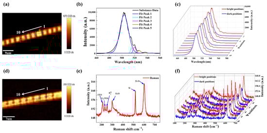 Figure 2d displays the Raman mapping image of CdS/CdS:SnS2 superlattice microwires, with ten distinct measurement points selected along the architecture for comparative spectral mapping at different locations. To further characterize the CdS/CdS:SnS2 superlattice microwires, we analyzed the Raman spectrum in the 200–800 cm−1 range, with the results shown in Figure 2e. Six distinct vibrational mode peaks of the CdS/CdS:SnS2 superlattice microwires are clearly observable in the spectrum: 209 cm−1, 228 cm−1, 250 cm−1, 302 cm−1, 520 cm−1, and 603 cm−1. These correspond to 209 cm−1, 228 cm−1, 250 cm−1, 302 cm−1, 520 cm−1, and 603 cm−1. Specifically, these include 209 cm−1 (CdS 1TO phonon), 228 cm−1 (CdS E1TO vibrational mode), 250 cm−1 (CdS higher-order mode), 302 cm−1 (CdS 1LO mode), and 603 cm−1 (CdS 2LO mode) [,]. Notably, the peak at 520 cm−1 does not belong to the CdS/CdS:SnS2 superlattice nanowire. Its appearance stems from the fact that the measured nanostructure was directly fabricated on a silicon substrate []. Figure 2f displays Raman spectrum corresponding to the ten positions marked in Figure 2d, with red curves designating the spectra from bright regions in the imaging and blue curves representing those from dark regions. The Raman spectra from bright regions exhibit greater intensity than those from dark regions. Therefore, the position-dependent PL spectrum indicates that the oscillatory peaks near the band edge in the superlattice originate from photon reflection at the CdS/SnS2 interface. Both the position-dependent PL spectrum and Raman spectrum further support the formation of the superlattice structure. Accordingly, the periodic distributions observed in PL mapping, Raman mapping, the PL spectrum, and the Raman spectrum provide indirect evidence for the formation of the microwire superlattices.